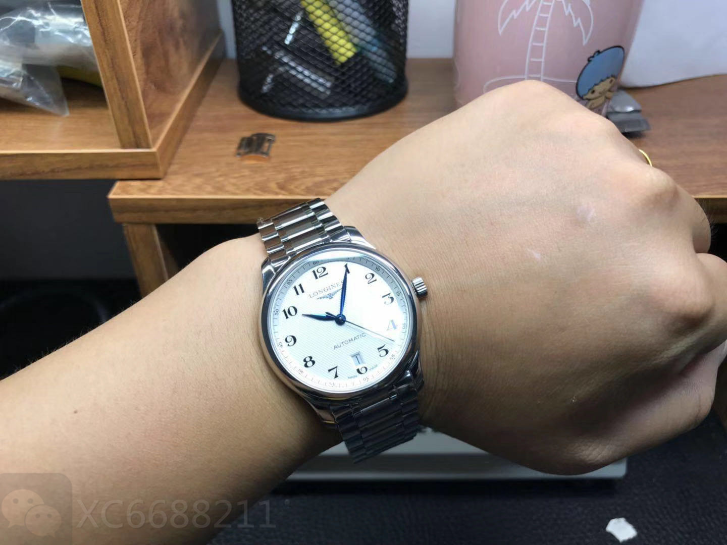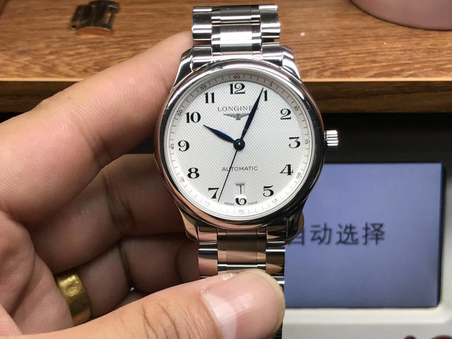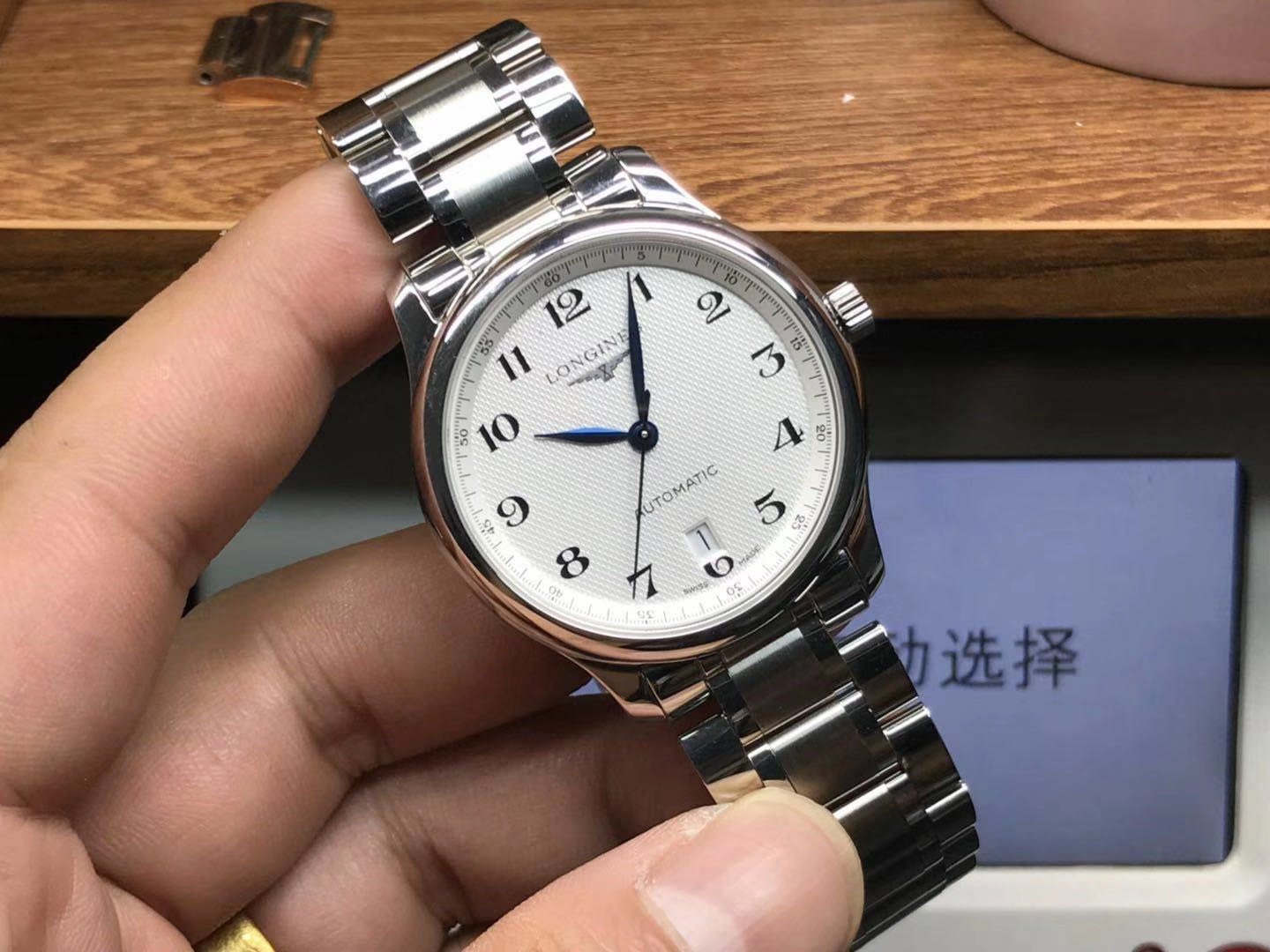镜面采用的材质的是与原装一致的蓝宝石玻璃镜面,防刮防划,抗震抗压性也是十分出色。表镜非常的通透,清澈可见。镜面还有防炫目处理,读取时间十分方便,白色表盘,主要盘面上装饰格子纹,工艺做的非常好,细腻密实。表盘整体的颜色搭配也是非常出彩,白色盘面上颜色分明的烤蓝指针,简单大方的三针设计,指针中轴工艺处理的恰到好处,非常完美看不到一点毛边瑕疵。十二点位置是浪琴经典的logo,立体感十足。六点位置处是设有一个类似相框状的日历窗口,层次分明,边缘处理的很好。盘面的大时标刻度采用的是阿拉伯数字,表盘外缘也印有阿拉伯秒针读数,字迹清晰可见,字体印刷非常对版。