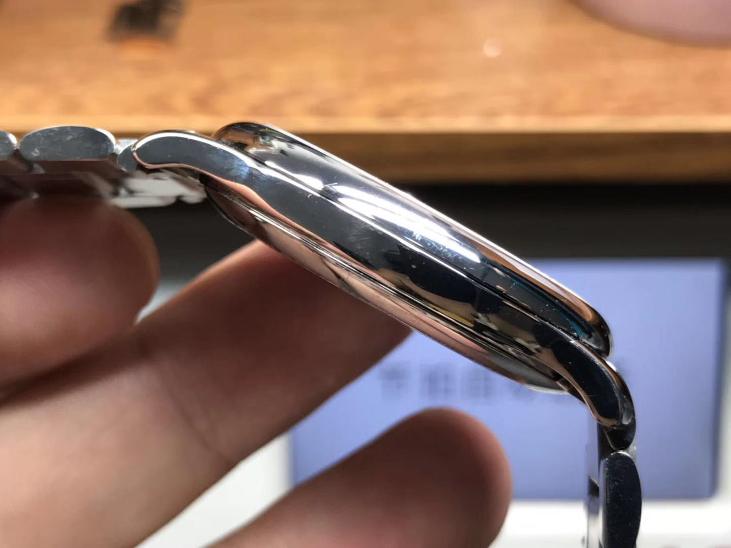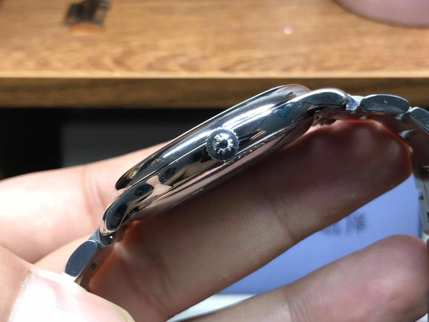 表壳与表镜完美接缝,不留一丝缝隙,结实的固定住表镜。圈口整体是非常规整的圆形,表面打磨非常的光滑饱满,十分明亮,旋入式的的表冠,把头四周装饰着一圈齿轮花纹,增强调节手感,更加便捷的调节时间。把头大小与正品一致,把头顶部是镌刻着品牌logo,打磨光滑,边缘的棱角处理利落,立体感很强!
