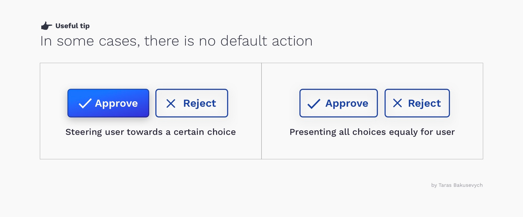 唯一的例外是,当所有选择都相等时,或者操作特别危险,在这种情况下,您希望用户通过自己的判断来选择按钮,而不是刻意强调的引导方式。