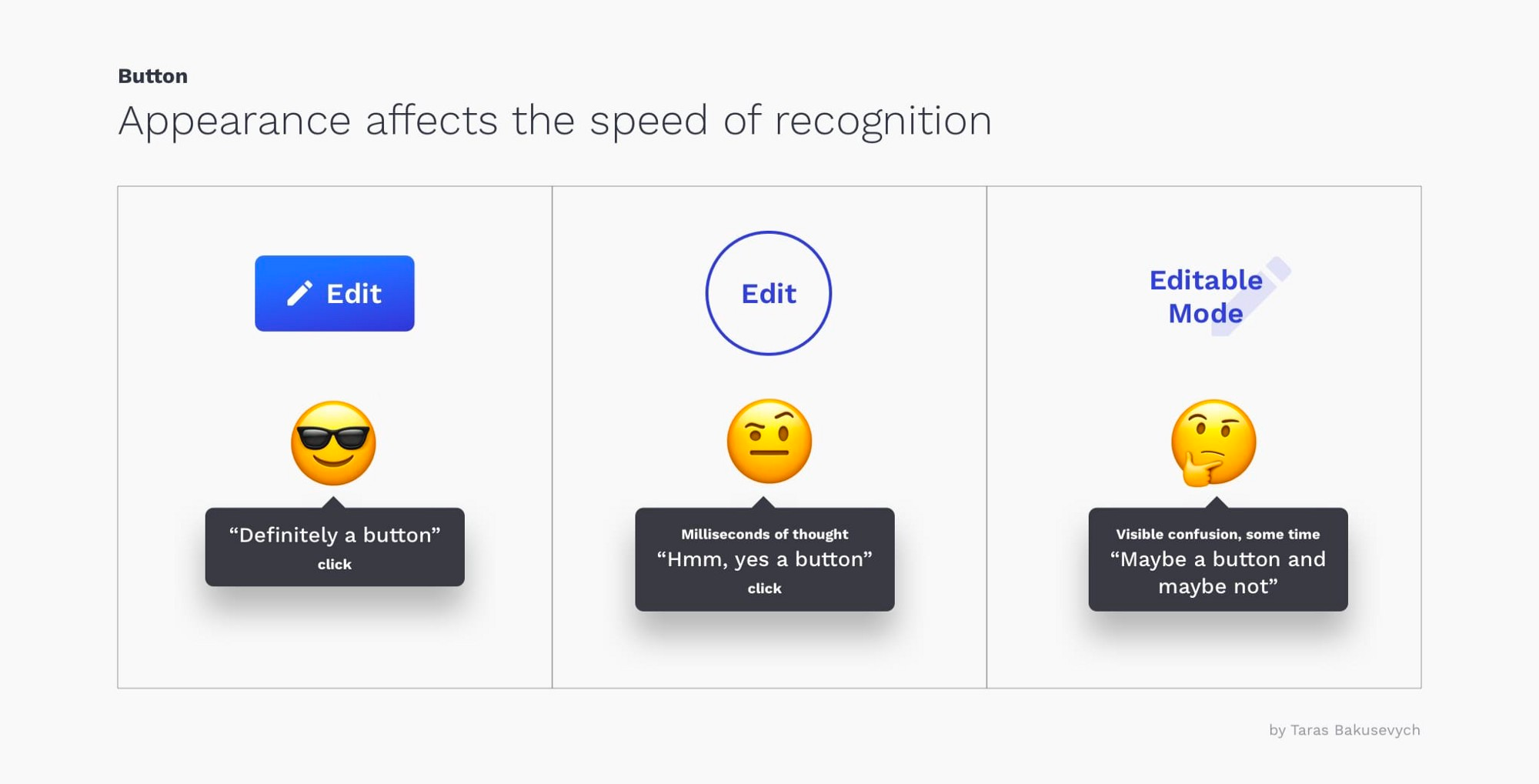 “不要让我思考”是可用性工程师史蒂夫·克鲁格(Steve Krug)撰写的书的标题。它涉及的许多要点中非常重要的其中一个就是,界面中的重点内容对用户显而易见,而不是引起困惑。基于多年使用各种设备和其他产品的经验,用户对按钮的外观和功能有了一定的期望。若“标准”的按钮有较大偏差会给用户带来延迟和困惑。