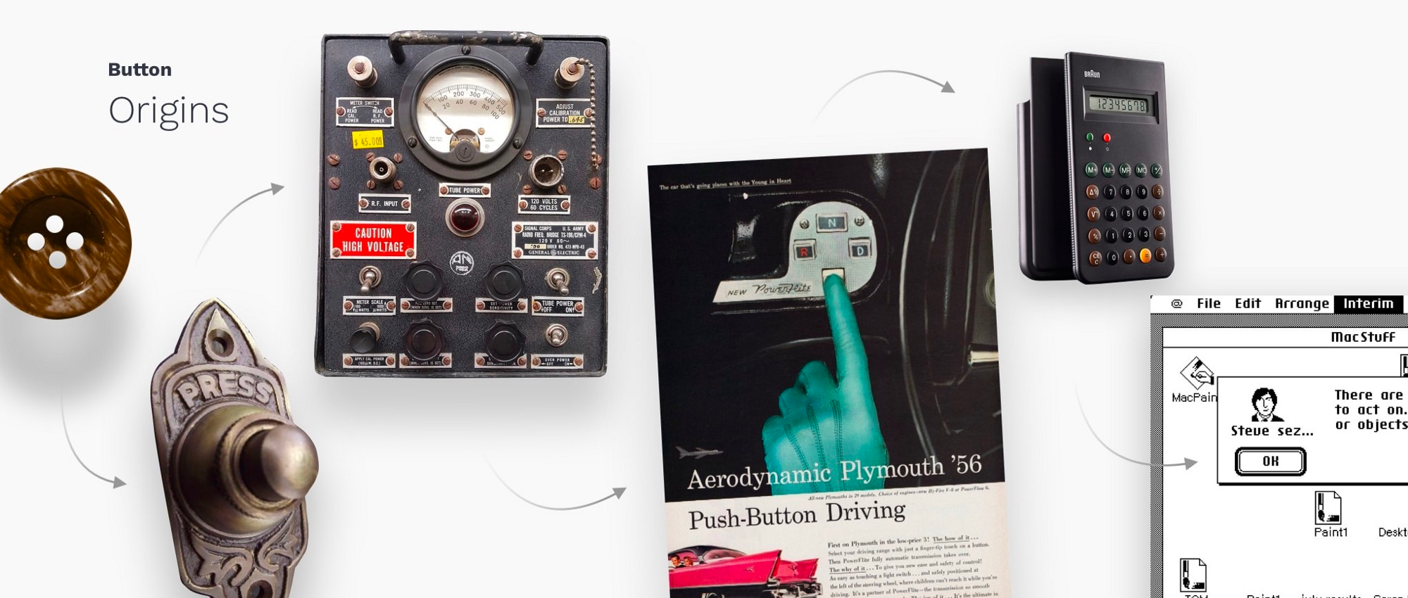 为了设计正确的交互功能,我们需要回顾一下物理按钮的历史和起源,物理按钮是UI按钮组件的前身,在如今的所有数字产品中都大量使用。按钮很棒。即使用户不了解基本的机制或算法,手指的触摸也会使电器,汽车或系统处于运动状态。在《电源按钮》中,雷切尔·普洛特尼克(Rachel Plotnick)追溯了当今按钮文化的起源,并描述了按钮推动成为数字命令手段的方式,这种方法保证了轻松,谨慎和可靠的控制。