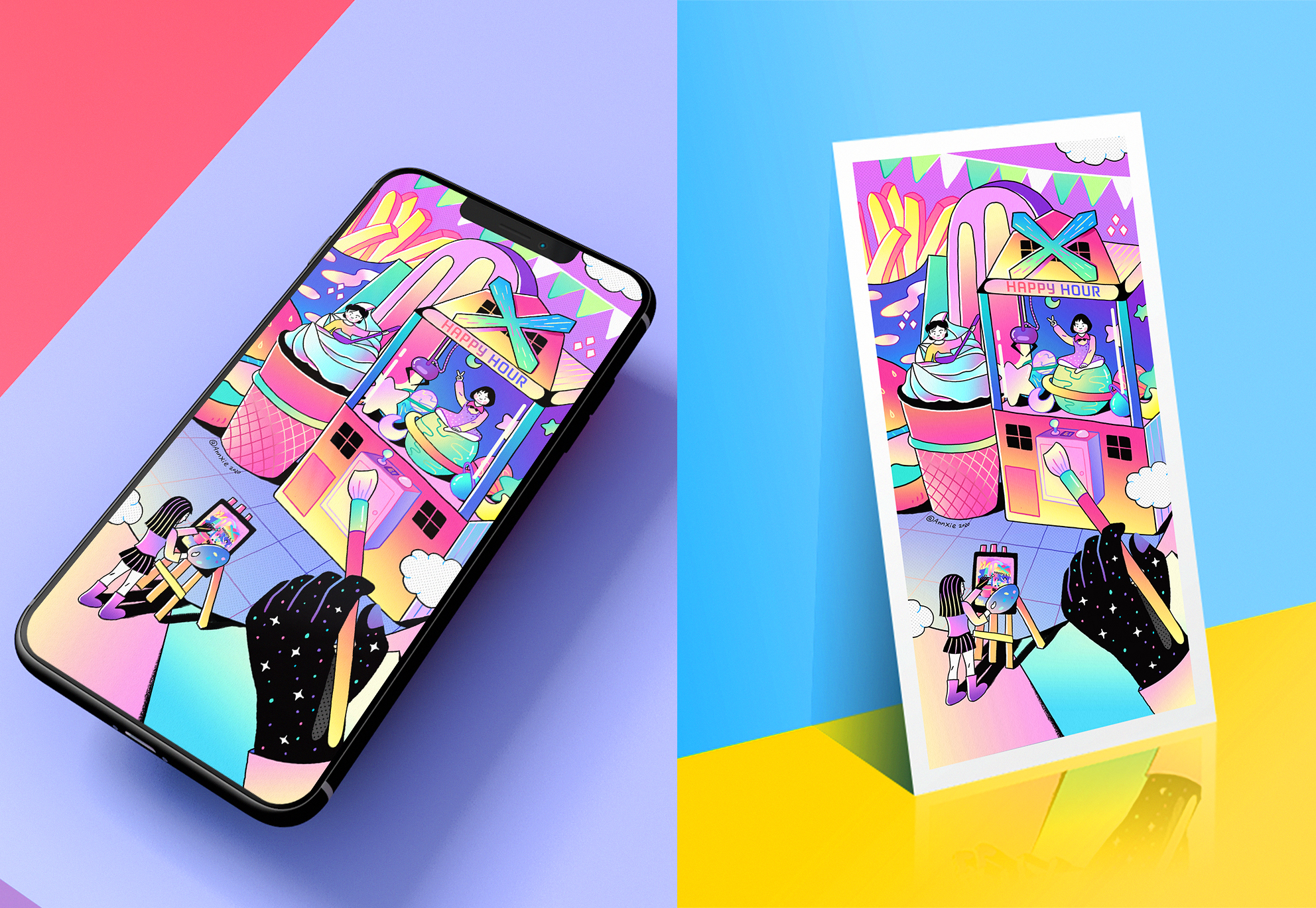 插画的主题、排版、元素、风格都可以借鉴,但是关于插画的情感描述,让作品成为无法被复制借鉴独一无二的灵魂。我的童年与汉堡、薯条、游乐场、画画离不开关系,其中画画占据了我小时候乃至现在的大多数时间,所以我在这幅作品中加入了使用星河效果处理的左手,与画面中正在作画的自己形成画中画的呼应,这是关于这幅名为【HAPPY HOUR】的闪屏创作里我认为最触动自己的地方: