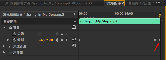 配合视频淡出,配乐音量需要减弱到无,选中一段音乐效果【控件面板】中将末尾插入关键帧,将「级别」调整为负值。