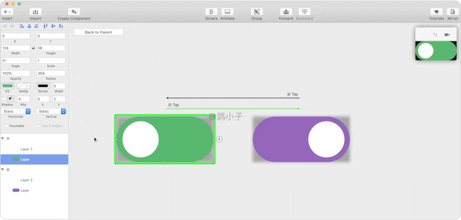 我们画一个简易的开关,给这个开关创建组件,并且添加点击事件,使得开关可切换。