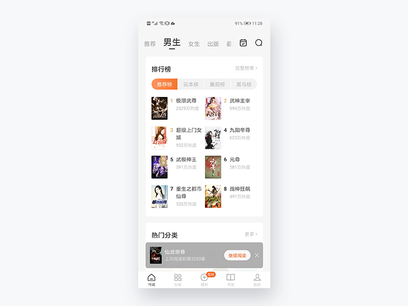 用户打开APP后,在首页下方会弹出上次最后一次阅读的书籍,方便用户继续阅读,时间持续5s左右,仅做为小说阅读软件来说,这种人性化的操作让人记忆深刻,也能感受到产品的用心