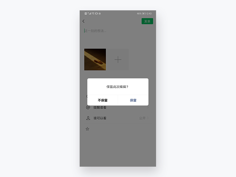 而弹窗功能,既与提示文案相符,保留了此刻的想法,又从某种角度来说提高了内容的质量,假设一个用户场景:用户在发布朋友圈时,可能会出现中途返回聊天列表去保存朋友传来的照片;如果内容开始有做保存操作,那可以使发布内容更加完善,更加贴合用户心理预期