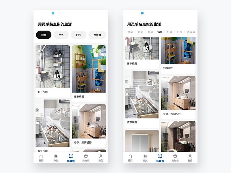 用户在点击场景购时,顶部有可左右滑动供用户选择的家居场景,选择比如:浴室,那么用户在下拉浏览的时候,顶部由开始的大按钮形态切换到小文字