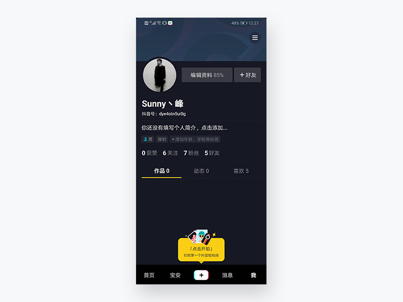 用户在注册后,没有发过一次短视频时,在我的作品中,产品会不断的提示“点击开拍,你的第一个抖音短视频”的动效字样来引导用户去发视频。