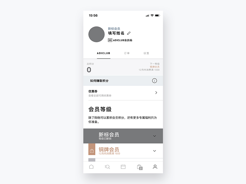 在adidas个人页面中,把会员积分作为首要展示,其次是订单、设置
