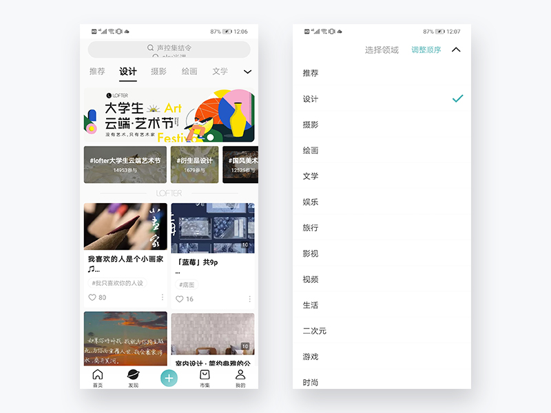 在用户进入LOFTER首屏显示的内容是“发现”板块,产品有意将用户引导到“发现”让用户兴趣圈能够不受局限,开阔更多视野,而在顶部标签栏中,用户点击下拉,可以把当前系统推送的内容进行主次或兴趣高低顺序的排版,这样的功能也能让用户后续使用过程中,舒适度更高