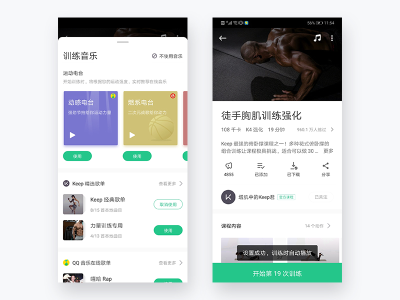 在开始Keep任何一项训练中,都可以在右上角直接设置音乐,并提供多种音乐歌单供用户选择