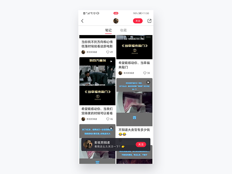 底部上升这一细节,既不打扰用户正常浏览笔记,又能通过细节动效吸引用户注意,较大程度提高用户点击关注概率