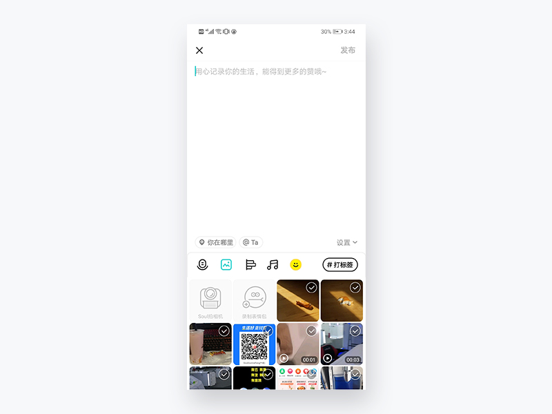 用户点击“发布瞬间”按钮,跳转到发布页面,这时下方“录制表情包”会出现断短暂动效效果