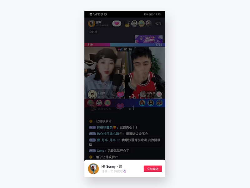 在直播PK环节中,当用户在场时间达到一定时,屏幕下方会出现“立即赠送”按钮提示,不同的是,此时屏幕除下方提示外,整体暗度会下降,突出下方“立即按钮”,这也算变相的引导用户去参与直播,调动用户积极性吧