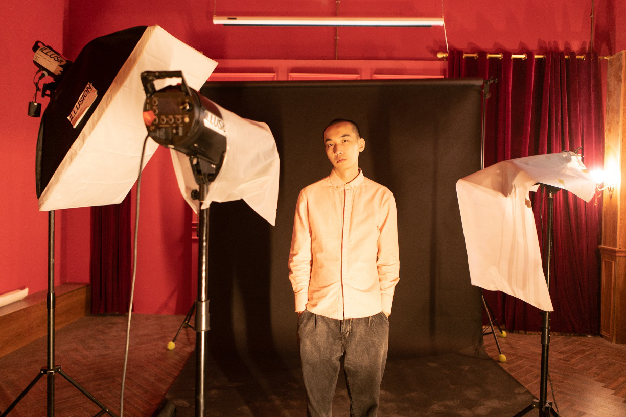 3- 拍摄第二个实影,人冲画面右站,面对B灯,这时候开B灯,关A+C灯,按下引闪器