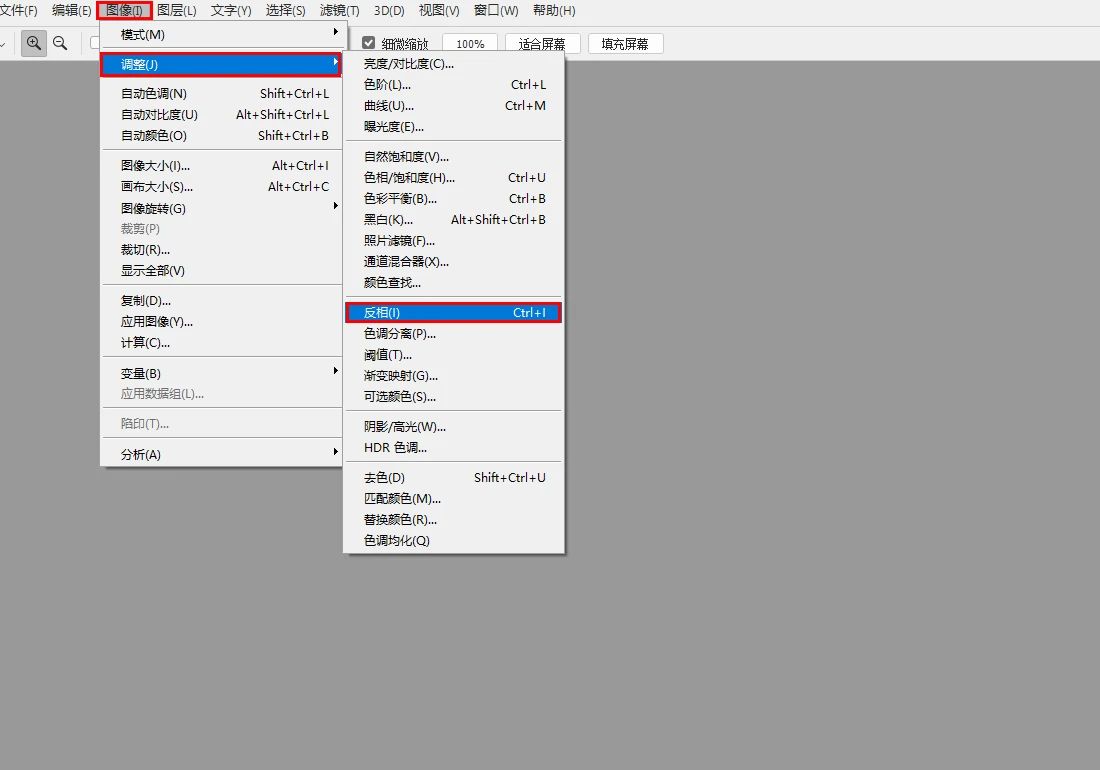 选择顶部菜单栏 【图像】 → 【调整】 → 【反相】,快捷键是 【Ctrl + i】。
