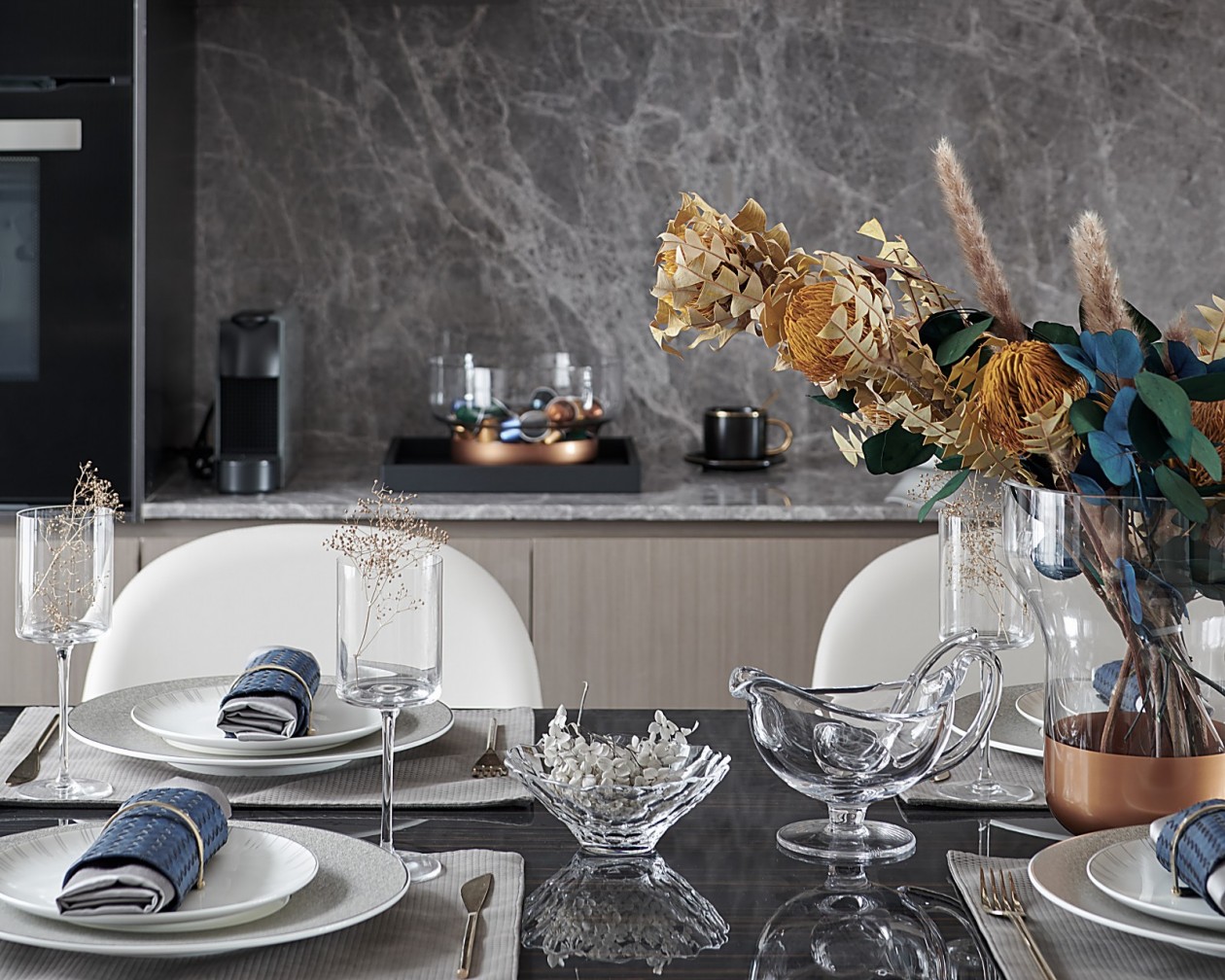 精致生活源于对细节的执着以求。餐桌设计结合金属、皮革与木材,造型简洁优雅,材质拼接处的毫厘分寸彰显出极致品质与奢华。以“泛舟湖上”为主题的艺术品,搭配进口水晶花器,以及通透质感的饰品,呼应折射水波粼粼的银色餐盘,令家人在身心愉悦中开启味蕾。