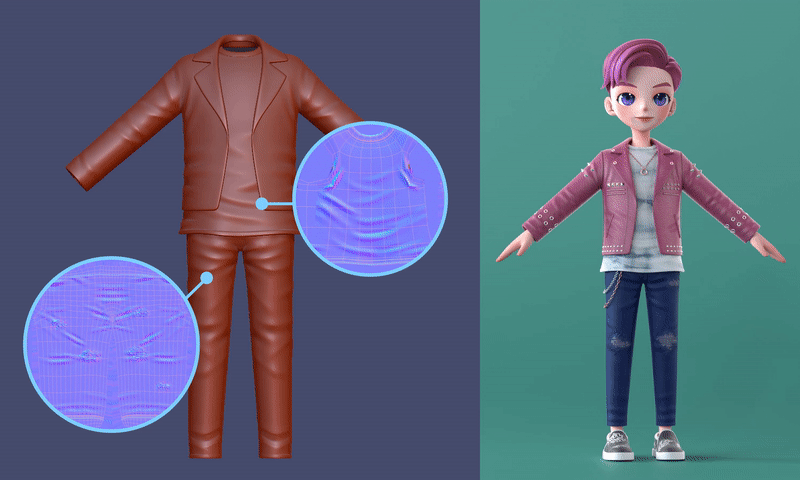 UV is the most important part in mapping progress because it can make wrinkles and express materials using normal map. The way to make UVs depends on the costume design and it is important to make UVs following the cutting line of the costume such as shoulder lines or pants cutting line so that where textures meet together does not go wrong.
