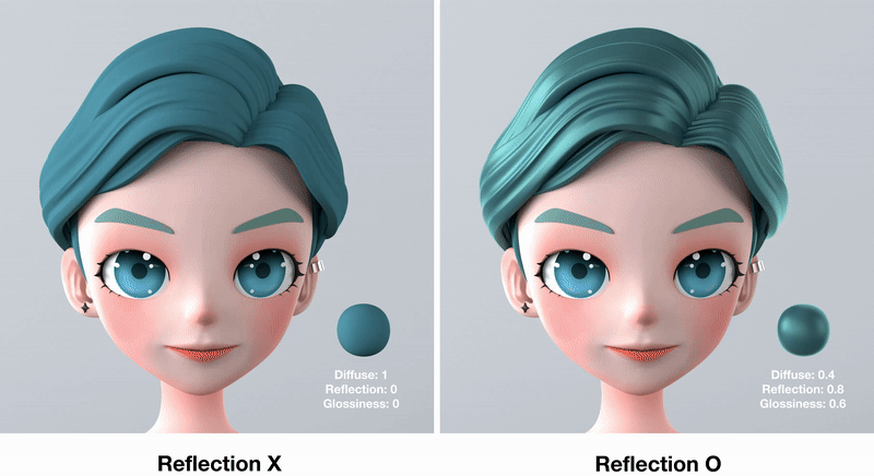 The hair color can vary a lot according to the reflection color and value, so if he reflection value is not applied, the hair color can become stronger and matte. By applying the reflection on the hair, the actual hair color and the reflected color can be mixed together so rich and attractive color can be embodied on the hair. Moreover, the hair will look more vivid through the part in which the light is reflected.