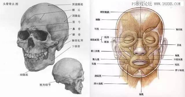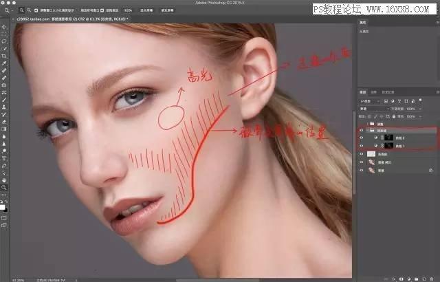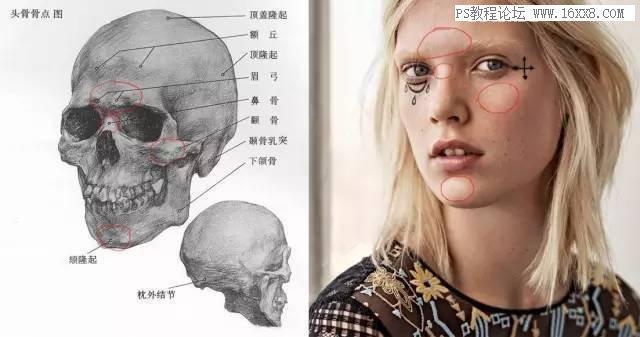 接下来给大家讲讲修的部分,在修之前我们需要了解脸部的几个骨点和肌肉走向,骨点是容易出现高光的地方,红圈位置就是对应的骨点高光,那肌肉走向就是我们要找的那些过渡面。