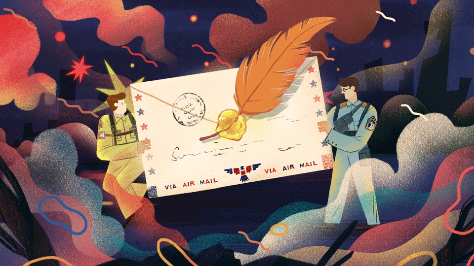 【摘要】:背景是战场,有一些打仗的人,中间两个主人公(身穿不同的战服)扛起鸡毛信, 信中间可以有一枚小金币