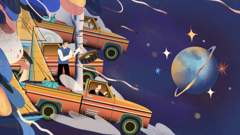 【摘要】:左边是汽⻋帆船,有好几个情节(修⻋,开⻋等等),右边是一颗小地球,代表从美国到世界