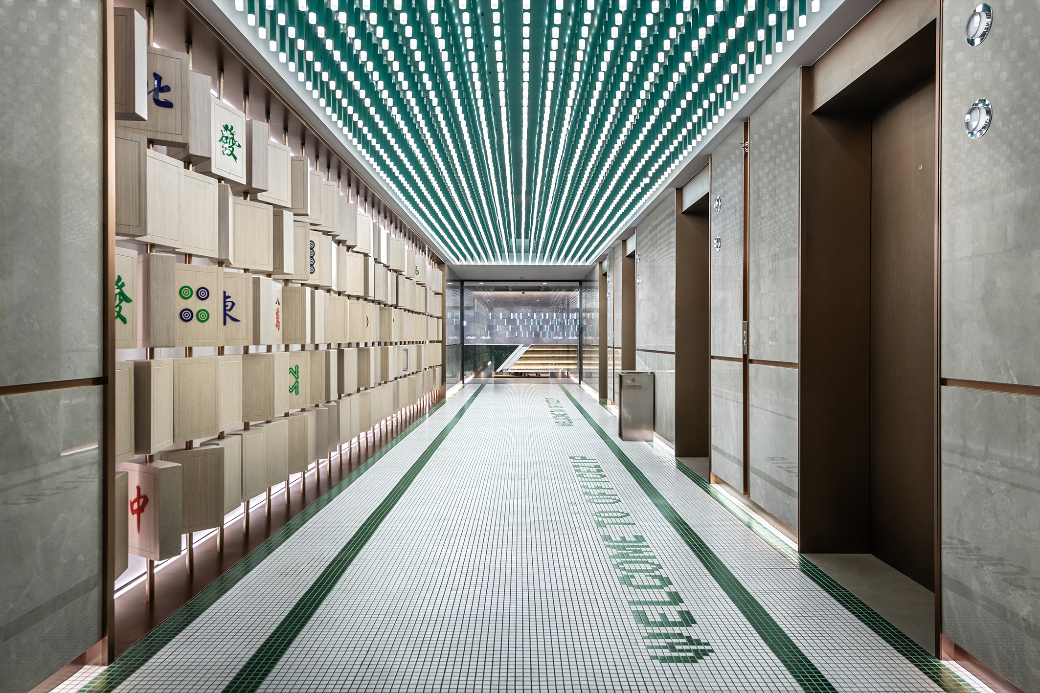 电梯前厅作为情绪的过渡空间,天花上面积巨大的照明装置由1615个LED,分布在19条线上, 在电梯门开启的瞬间燃爆眼球,带来使人振奋的视觉效果。