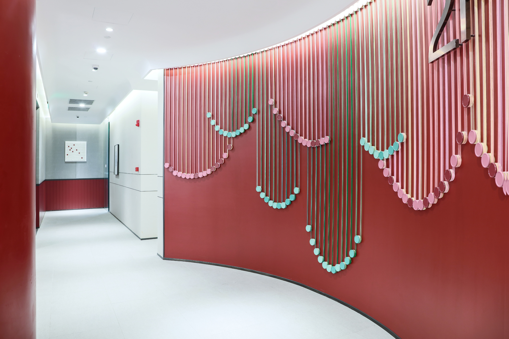 北京中海广场OfficeZip联合办公,在滚梯入口处的通过空间,是人们每天开始工作的起始点,设计师在这里设置了从天花垂挂下来的以彩色渐变线为主要形态的装置作品,以流畅跳跃的艺术形态引导人们进入一个五彩缤纷的工作状态。