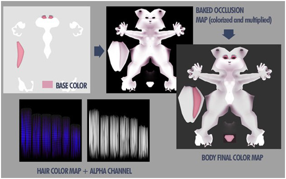 我选择了一个蓝紫色的颜色方案来做最后的渲染,所以这些是我在贴图上使用的颜色。身体的肌理是手绘的——没什么特别的;这些衣服纹理是从整体纹理开始的:第一卷和细节是用一些自定义笔刷绘制的。我为所有的纹理制作了一个遮挡通道,并使用它们对最终的贴图进行着色,同时添加阴影区域(图09和图10)。头发是用Photoshop绘制的。
