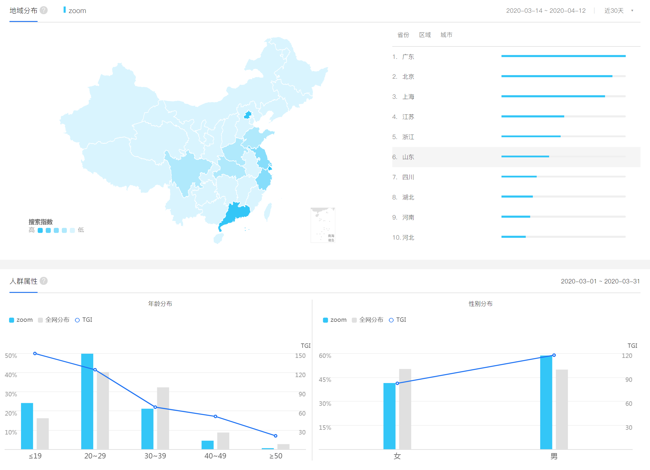 Zoom用户主要集中在珠三角、长三角、北京,这主要是因为这些地方经济发达,大小公司及劳动力主要集中在这些地区。