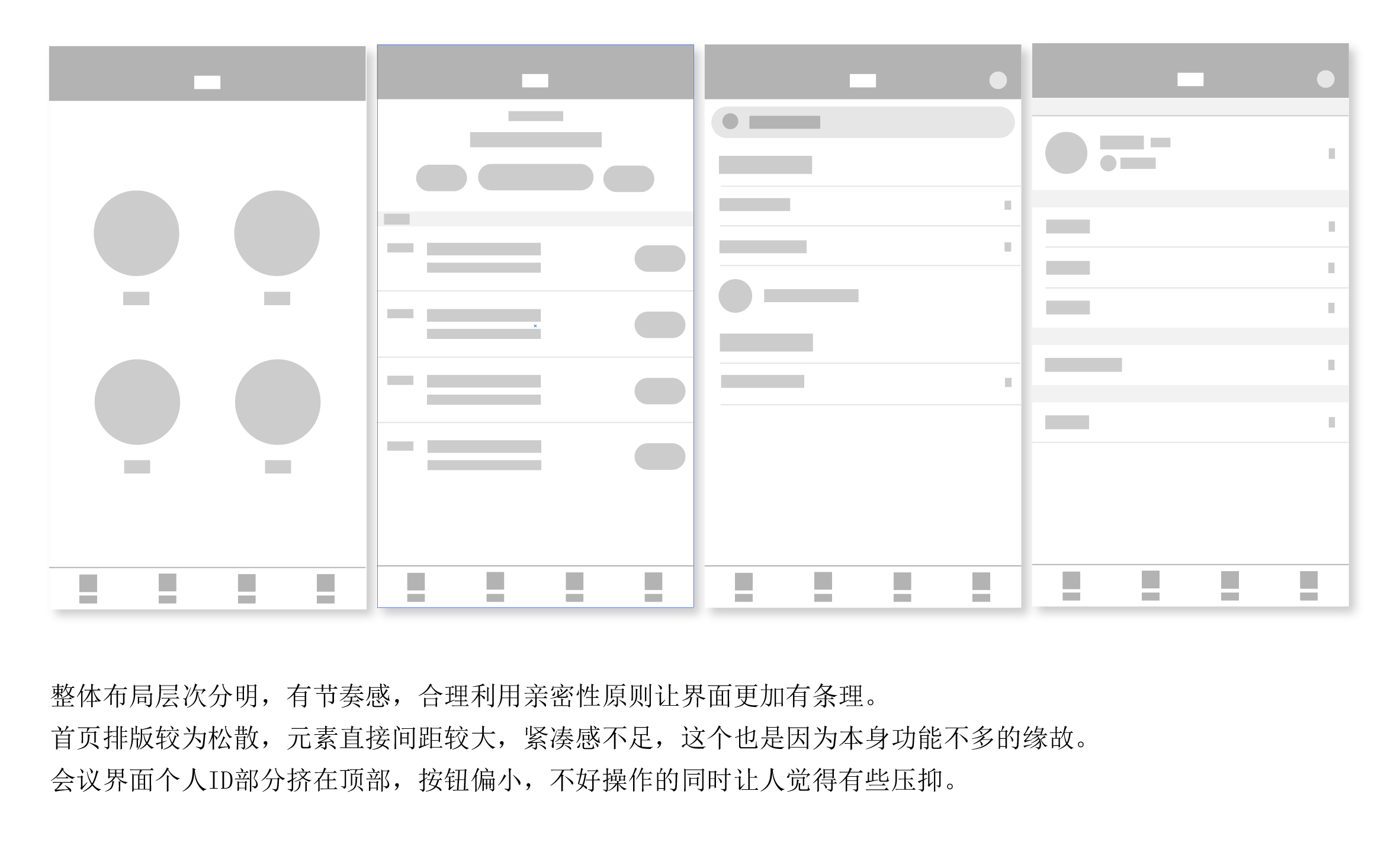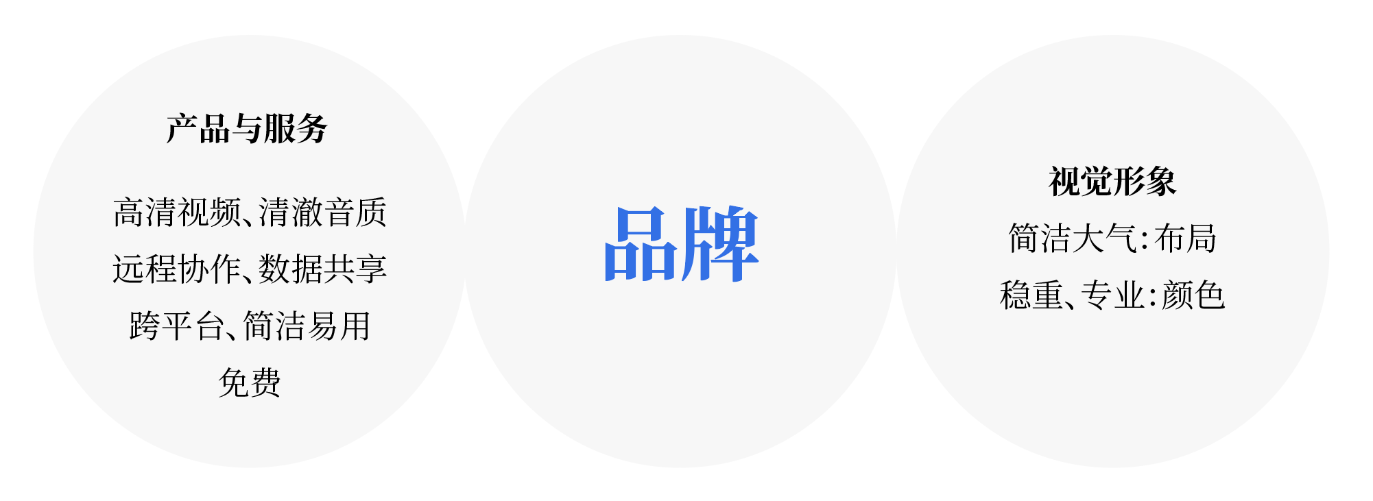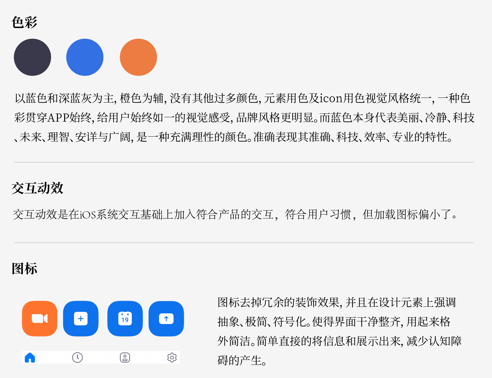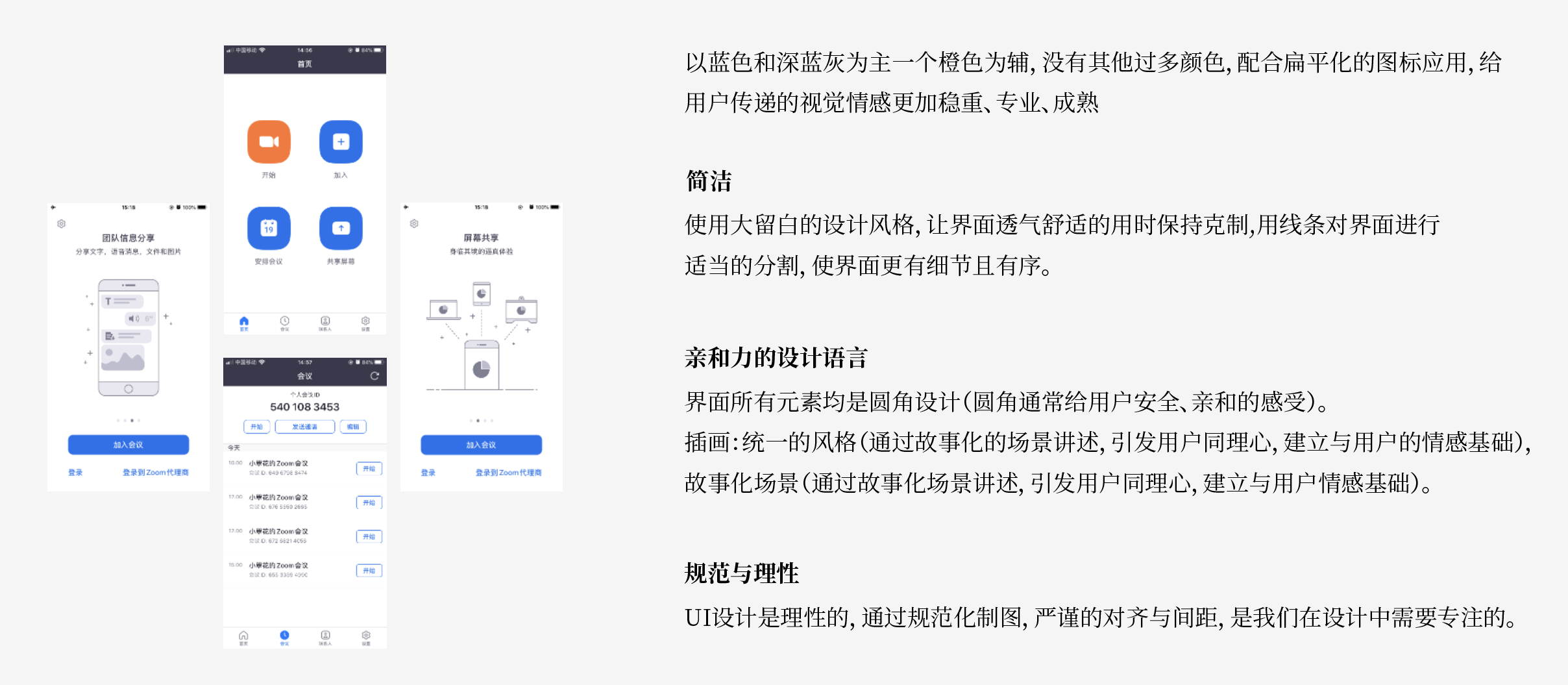 结论:一个品牌主要由产品功能及其视觉形象构成。在视觉设计中融入品牌因子,让产品在传达内容的同时也在不断传达产品,让用户不断的接触产品。起到潜移默化的在用户心中塑造品牌形象的作用。Zoom简洁易用的定位贯穿整个APP,以logo标准色蓝色和稳重的深蓝灰色的应用无一不在告诉我们,zoom是专业的,只专注于云视频会议,因而加大了用户的zoom的信任度,我们在日常设计中也要先把自己产品的定位先理清楚了再去做,避免只根据自己喜好去设计。