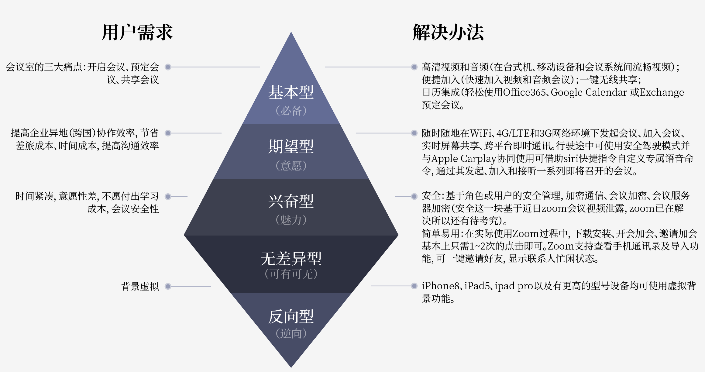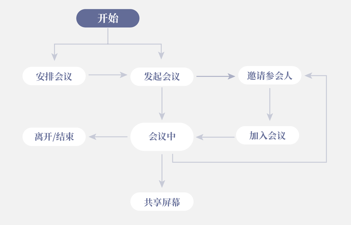 从业务流程图可以看出,zoom的核心功能只有一个就是进行视频会议,其他视频/语音质量、跨平台、数据共享、屏幕共享等功能都是围绕视频会议展开的。