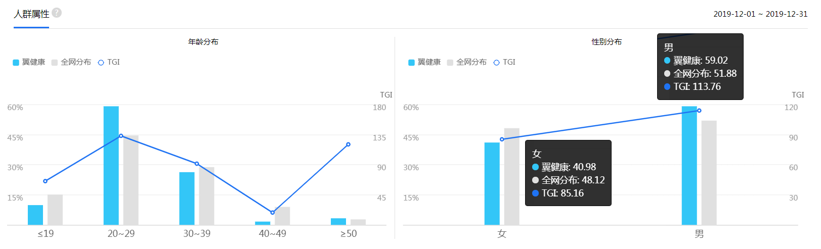 由百度指数中可知翼健康的用户主要是20-39岁,其中男女比例相对平衡,这是因为这部分人介于生育年龄同时是家中主要劳动力时间相对不自由而又有大有少需照顾