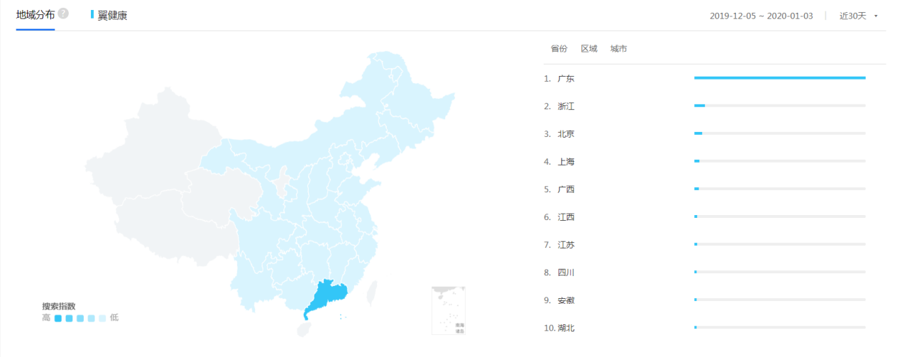 由百度指数中可知翼健康的用户主要是广东和经济较发达地区,在广东是因为这款APP是电信广东分公司开发的,更易推广,还有就是这些地区的人收入相对较高,生活水平较高,对健康的追求更高,但这些地区的人大部分有工作,时间相对不自由