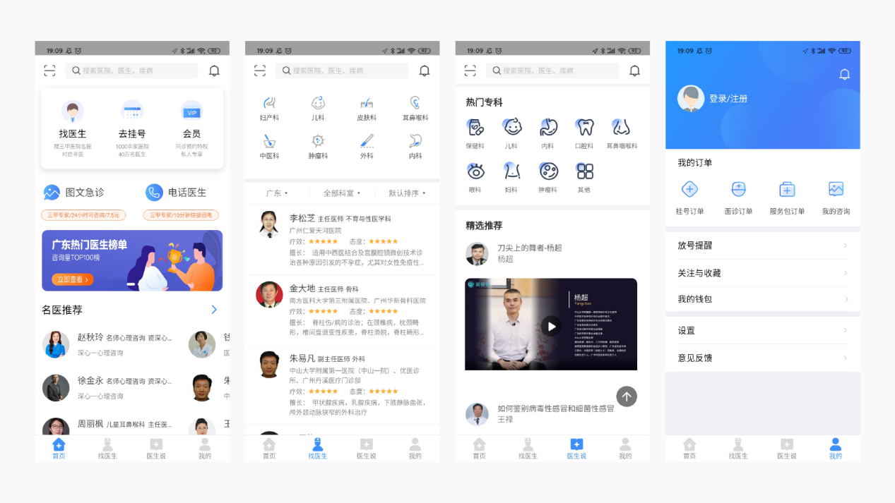 整体来说,首页金刚区图标相对较弱,同时细节过多,找医生和医生说模块两处图标风格差异大,并存在同模块不同图标情况,不利于用户辨认