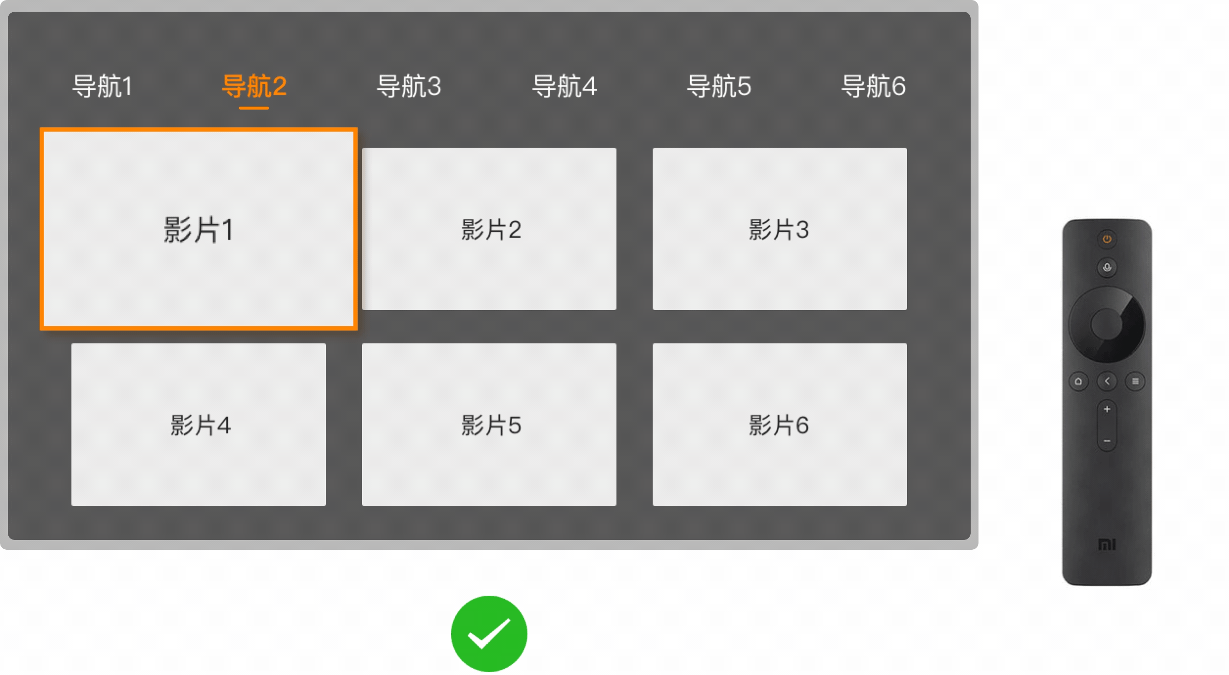 焦点根据遥控器的上/下/左/右按键,呈现“十字”形移动。在屏幕内容区域划分规整、且无空缺情况下,不支持斜向移动。