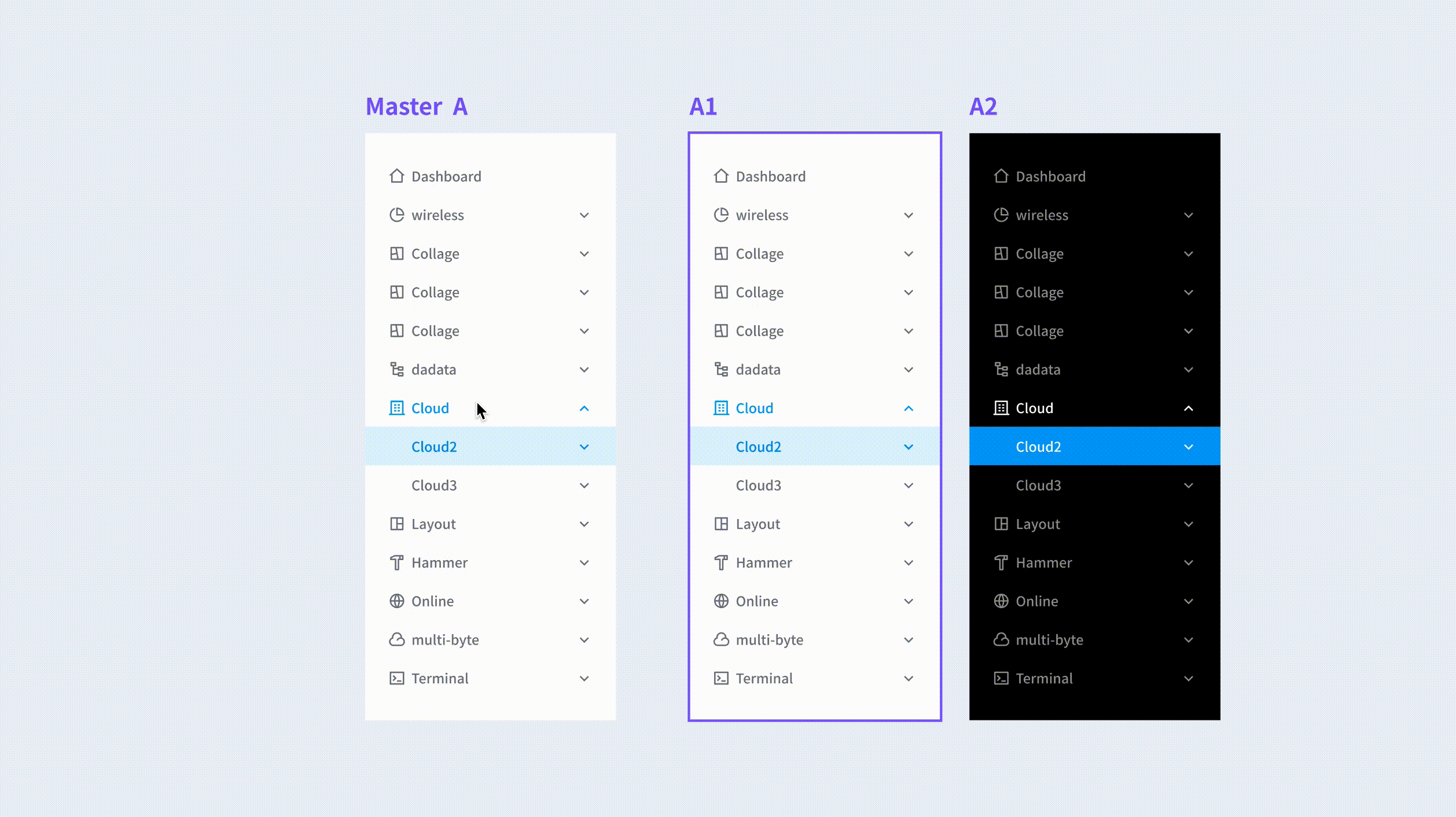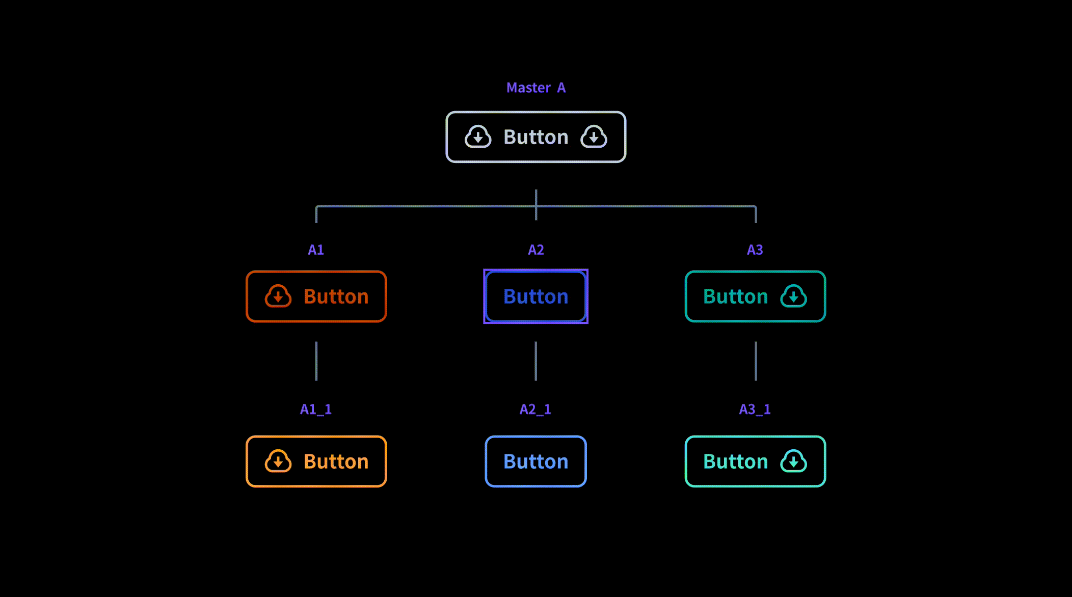 组件分级嵌套可以帮助我们更加灵活的管理组件库,上图Master A为组件母版,而A1、A2、A3从母版拷贝而来(副件),对副件进行样式修改后创建为新的组件并拷贝至A1_1、A1_2、A1_3,这样就实现A 管控 所有A的副件,而A1可以单独对A1_1进行管控而不影响其他副件。