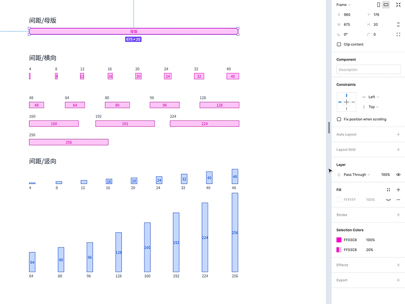 在Figma中间距需要组件化(Component),自动布局(Auto Layout)可以算Figma组件化中的杀手锏,通过简单的属性设置就可以实现自动布局效果;在间距创建中需要对横向(X轴)以及竖向(Y轴)分别进行创建并以不同的样式来区分,当然所有的间距都是通过母版(Master Component)进行复制创建的,这样可以通过母版来对全局的间距进行样式管控。