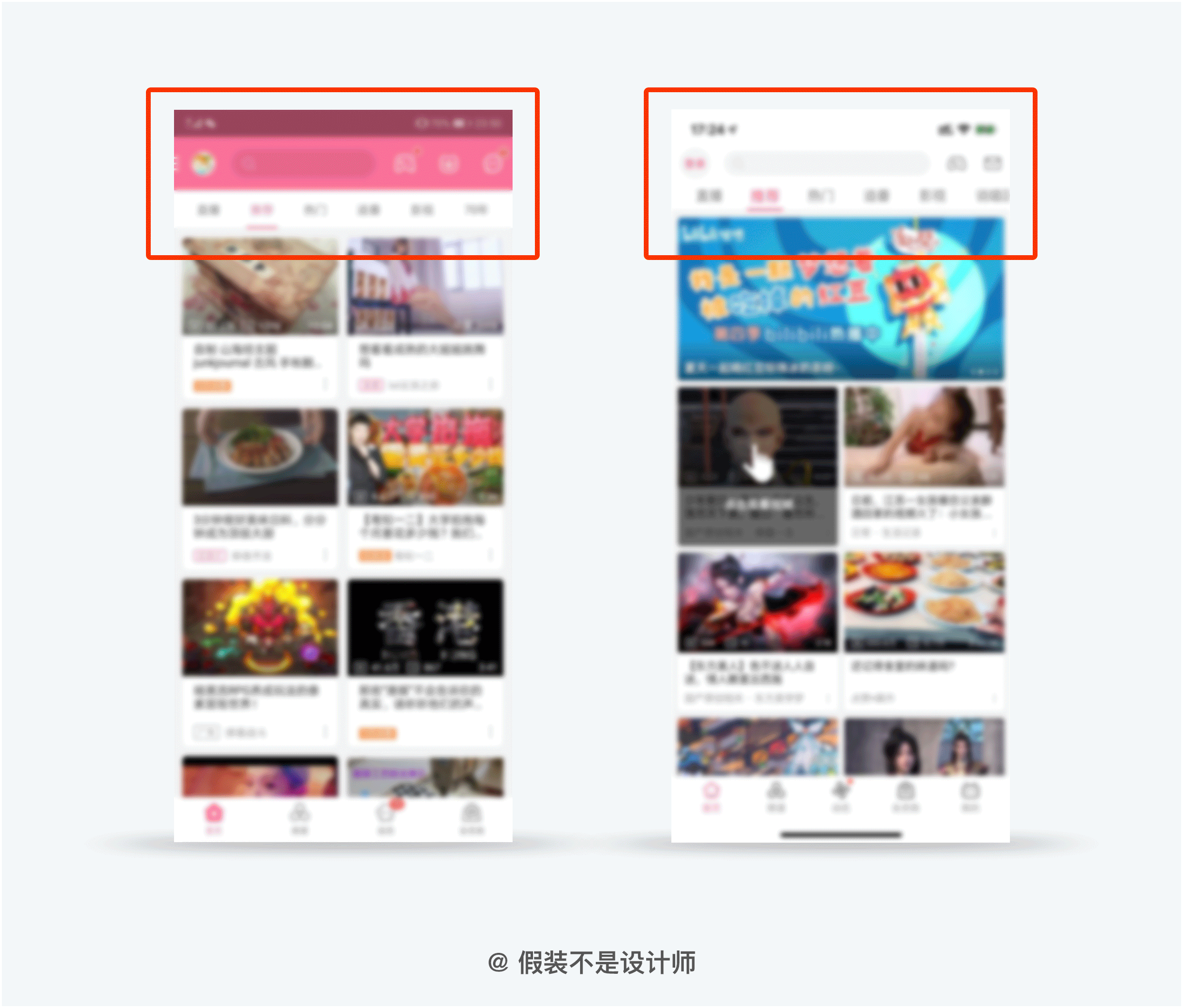如图对界面进行高斯模糊处理,根据醒目程度判定时,发现最醒目的是顶部搜索栏,而对bilibili这种以聂内容为主的产品来说,阅读需求才是核心。降低顶部栏背景与内容的的对比,使用户的视线更聚焦于内容本身。