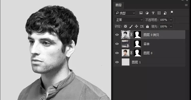 把森林的照片放在人像的图层上面,选中森林图层,按住ctrl键点击人像后面的蒙版图层进入人像的选区。
