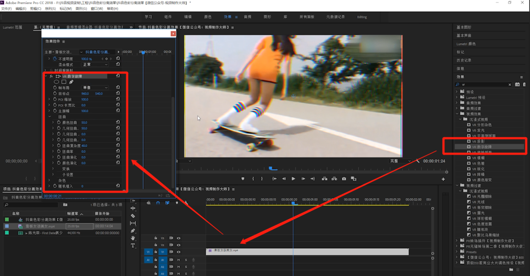 2、(如下图)效果面板搜索VR数字故障效果—添加至视频素材
