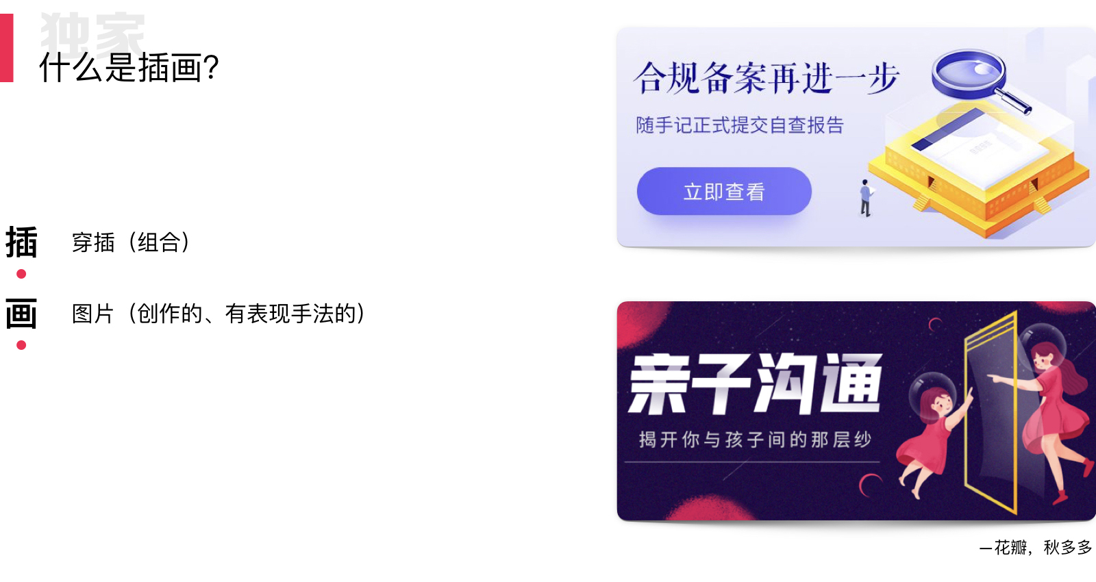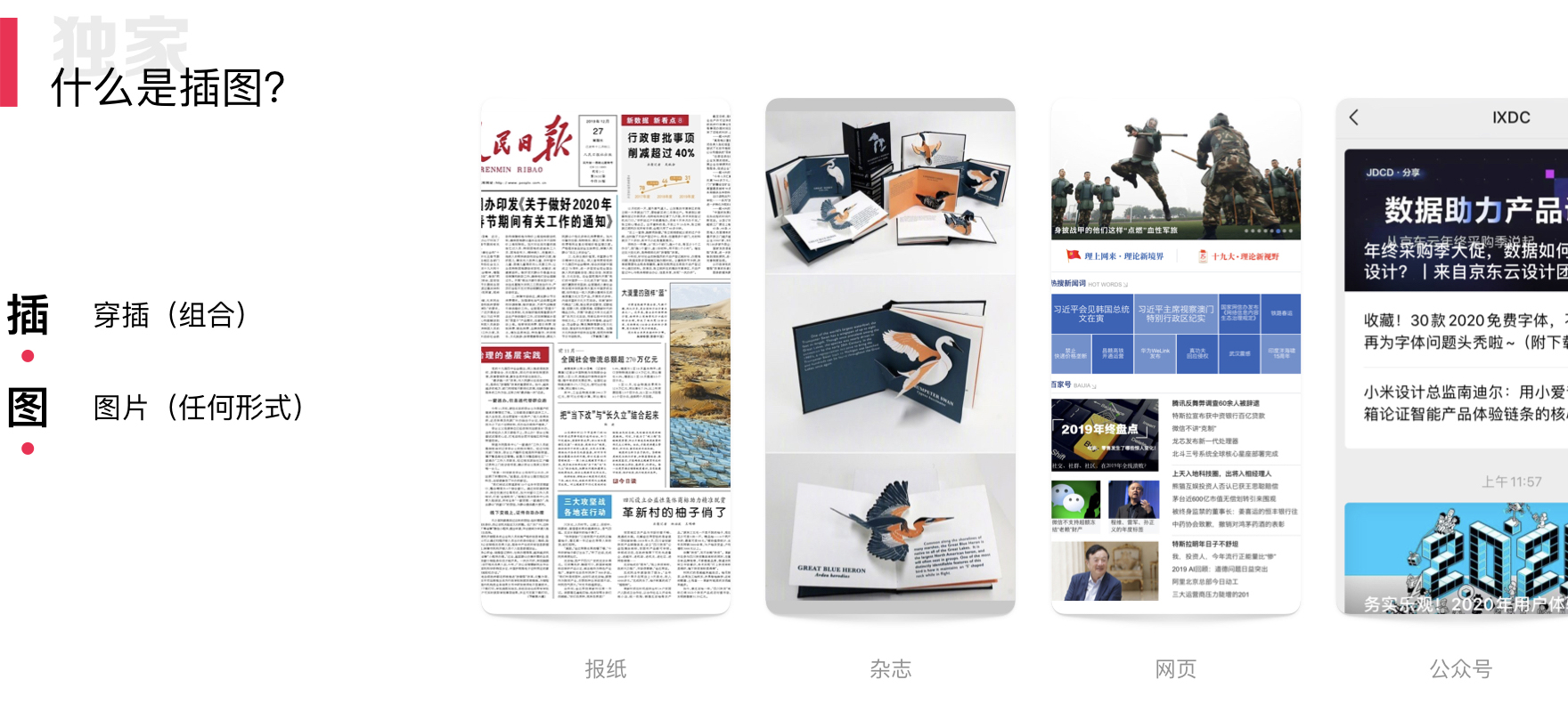 我们按照时间线来看,先看「插图 」。插图,“插” 就是穿插的意思,有穿插说明就有组合。而这里的“图”泛指各种形式的图片,包括照片、绘画、立体图等。结合场景我们来看,有报纸、书刊、杂志、网页、公众号等等。