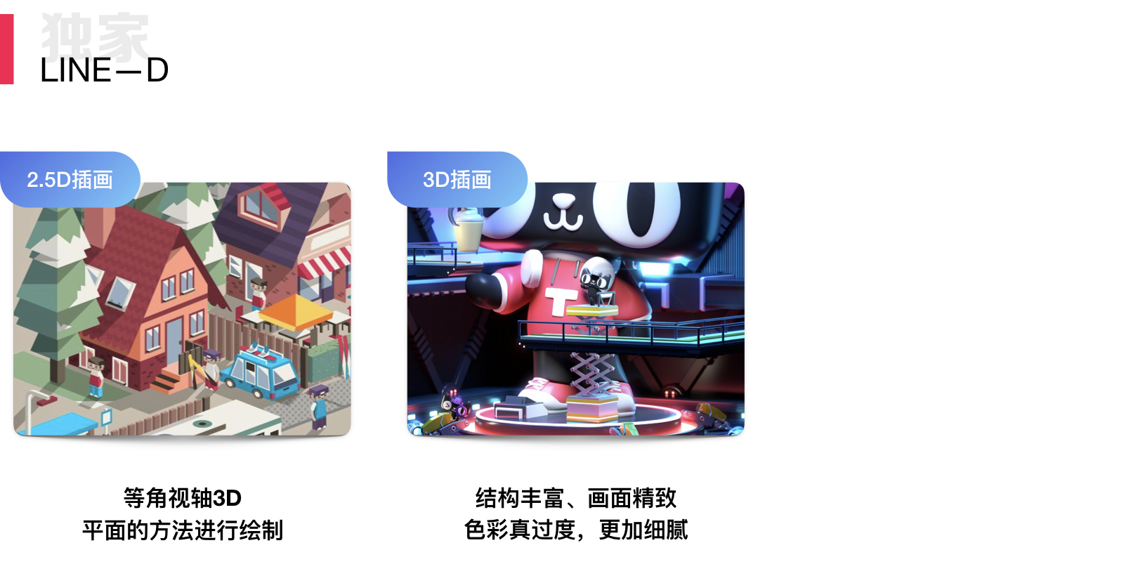 LINE-D 早时期,硬件限制+软件限制。导致3D制作无法快速实施,于是2.5D便被推了出来。随着C4D等快速建模渲染的软件问世,加之硬件配置的提升。3D开始登上了设计舞台。真3D估计也不远了。