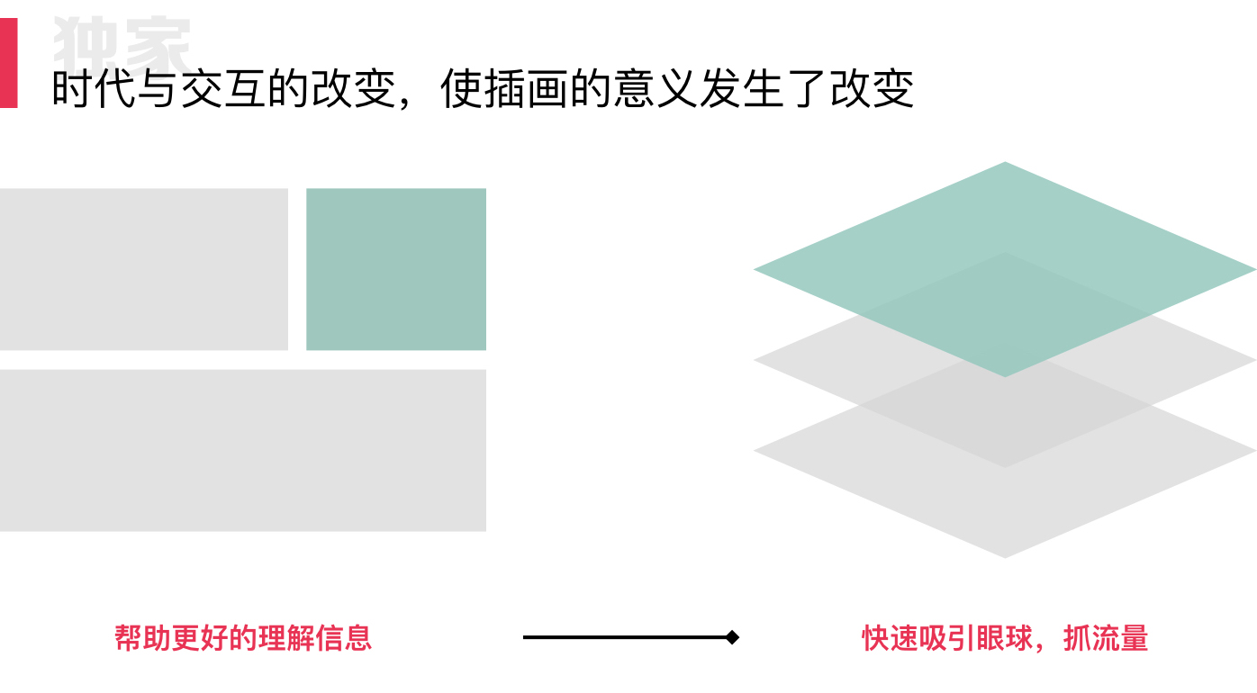 在以往我们信息的传递是相对平面的,用户也没什么选择。而如今,信息的传递由平铺式变成了递进式。人们的选择也越来越多。所以快速的吸引流量成为了插画存在的另一个意义。