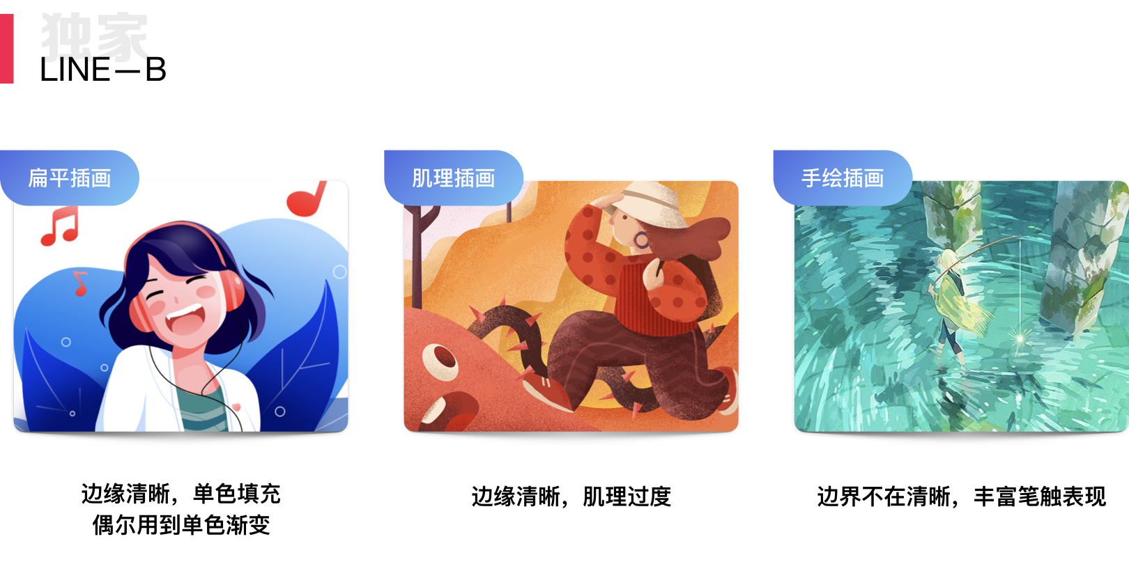 LINE-B 这条路线是在基础的形状插画上,希望画面的色彩更加丰富,更华丽一点,就衍生出来另一种插画,肌理插画。当肌理上升到笔触,就衍生出来手绘插画。