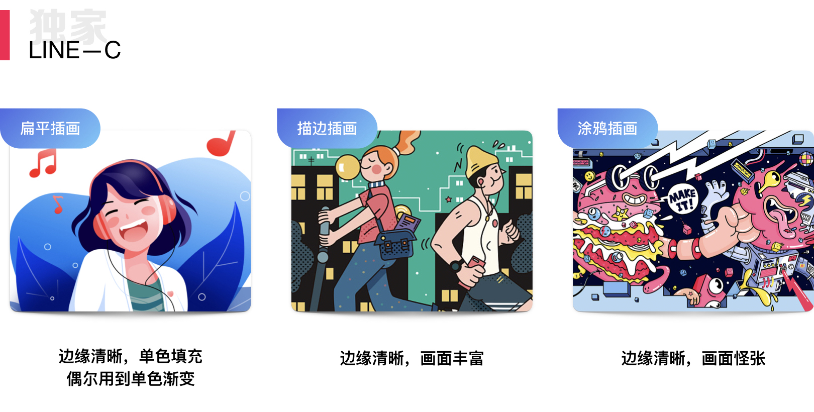 LINE-C 这条路线是在基础的形状插画上,希望画面的色彩更加丰富,更华丽一点,就衍生出来另一种插画,描边插画。过于安分的风格,无法体现艺术的怪张,于是升华出了涂鸦插画。