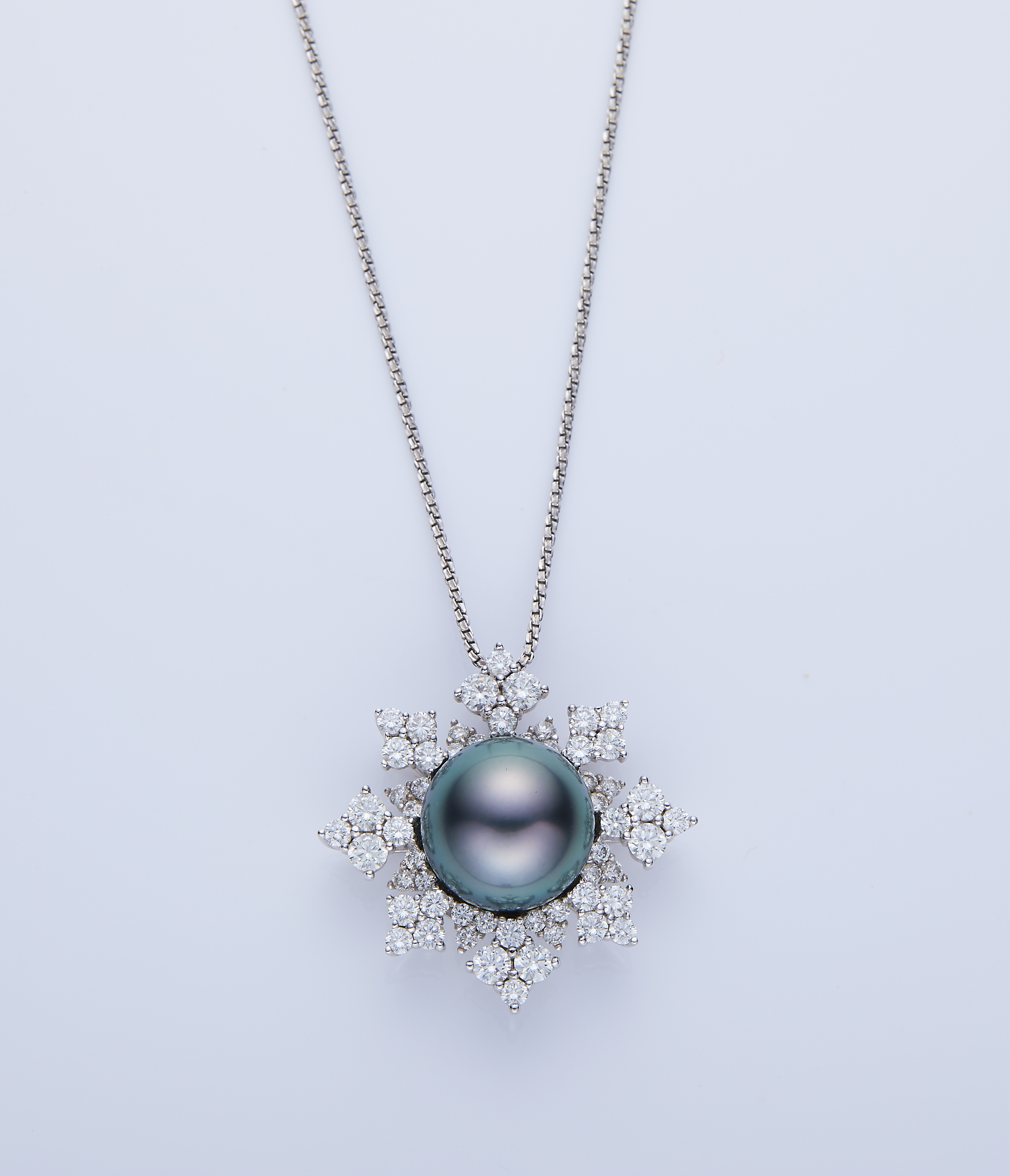 K金链子流畅而有质感,达到预期。最后我们将单独拍摄的链子、钻石、花头、珍珠分别使用PS合成在一起,取其精华铸成一体。最后我们得到一个富有金属质感、链子流畅、钻石闪亮,珍珠有光泽的图片。