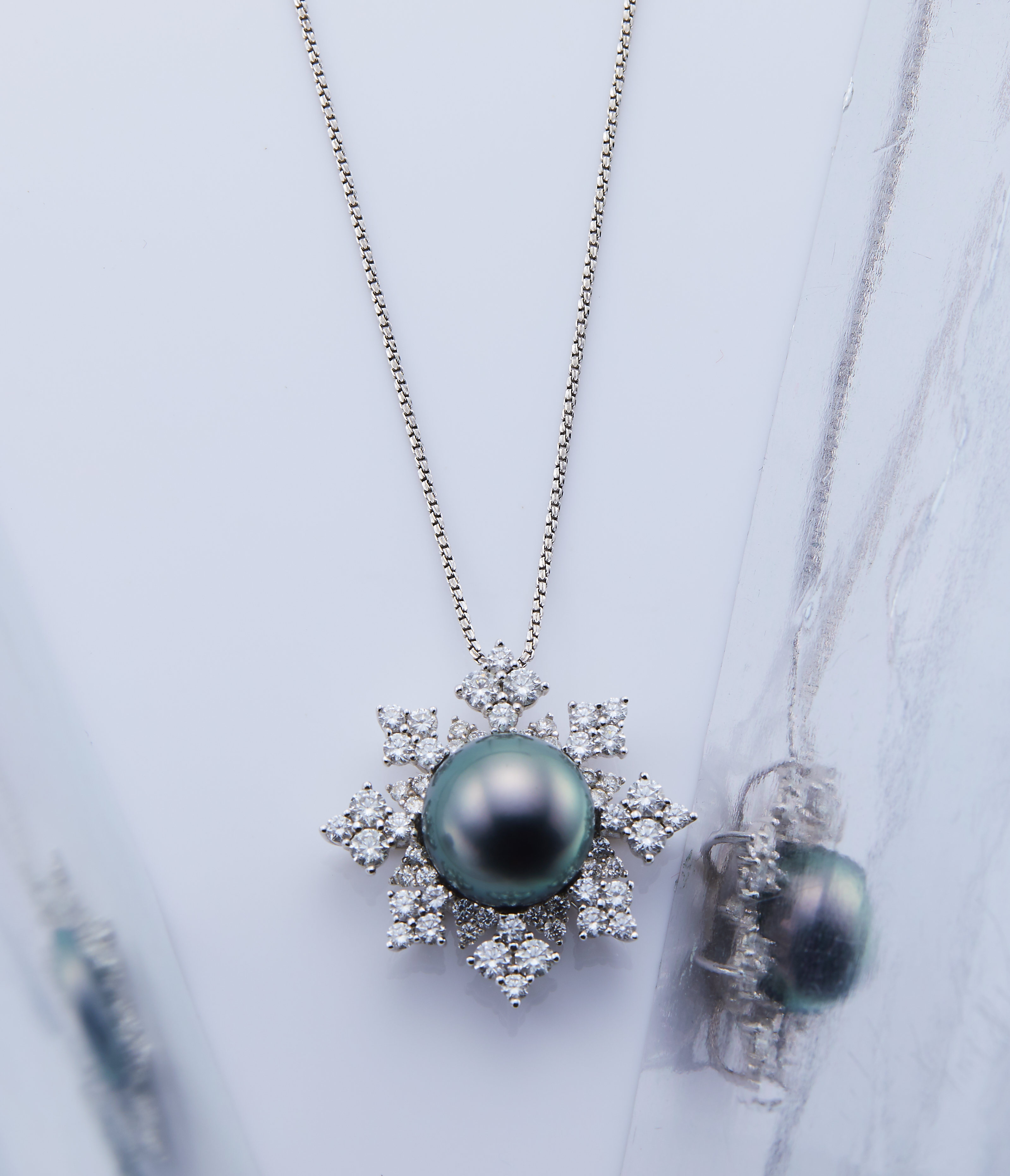 钻石明显得到改善,金属质感表现强烈,相较于花头质感链子层次较弱,我们换一种布光方式将链子拍出理想的效果。