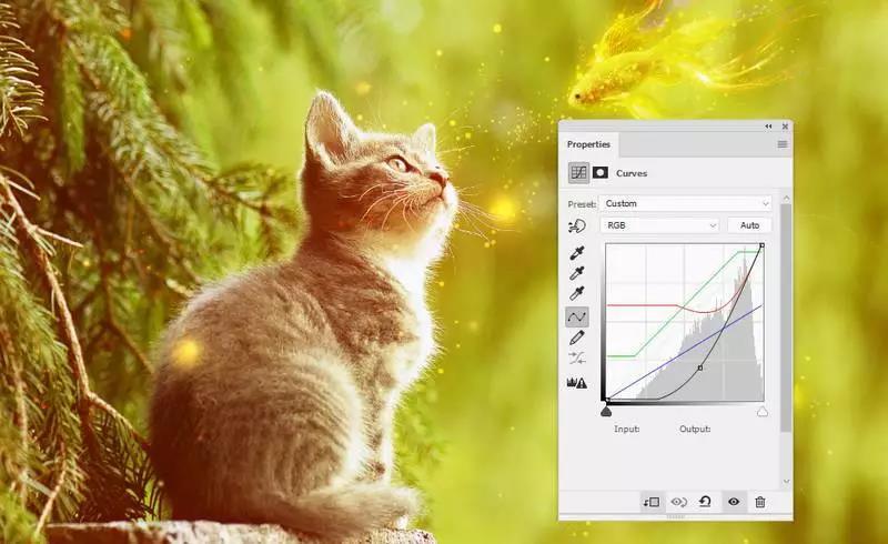 创建一个曲线调整图层,为鱼类带来更多光线。在这个层面膜上,使用柔软的黑色刷子在鱼体的上部涂抹,以减少那里的光线。