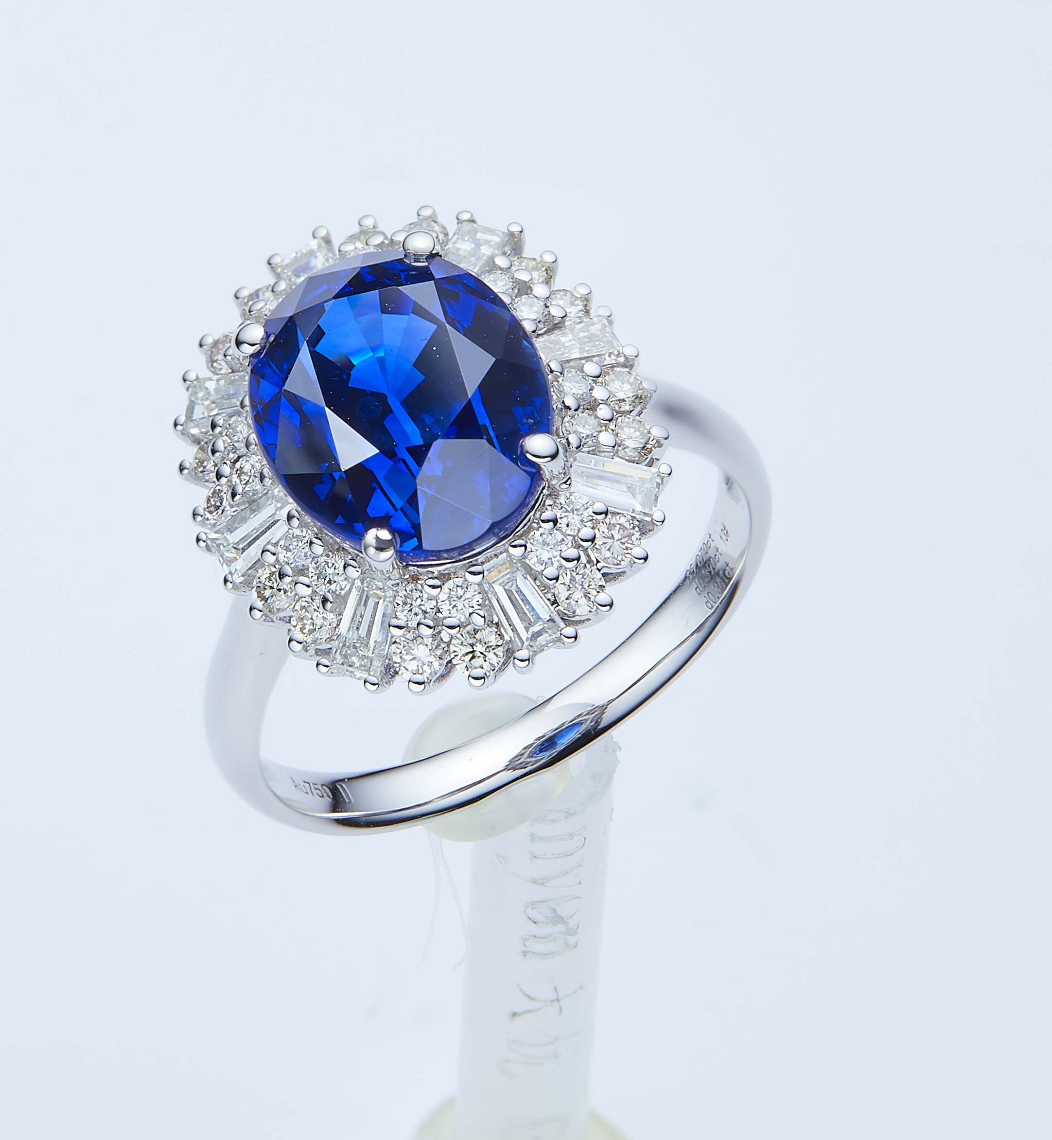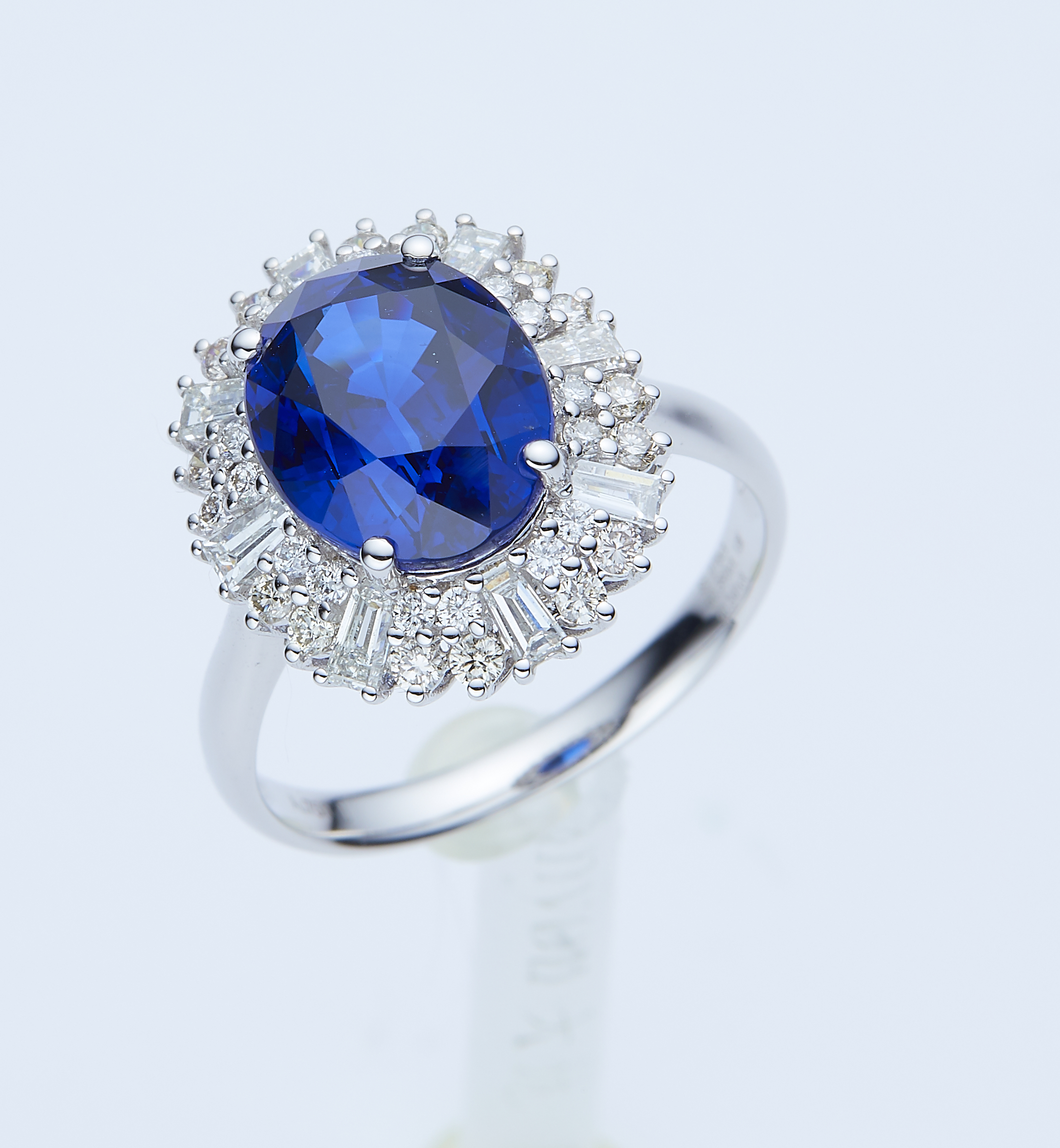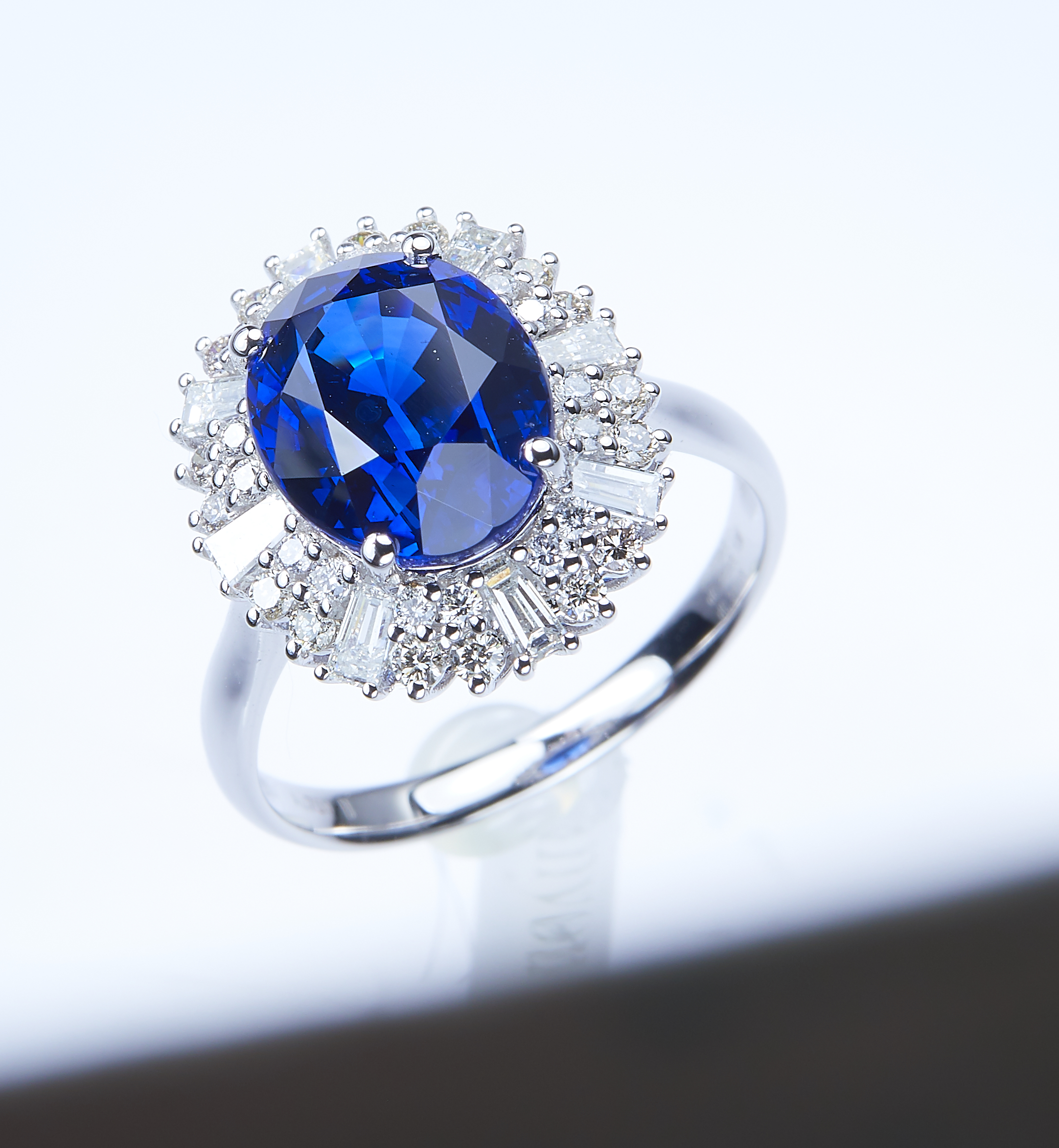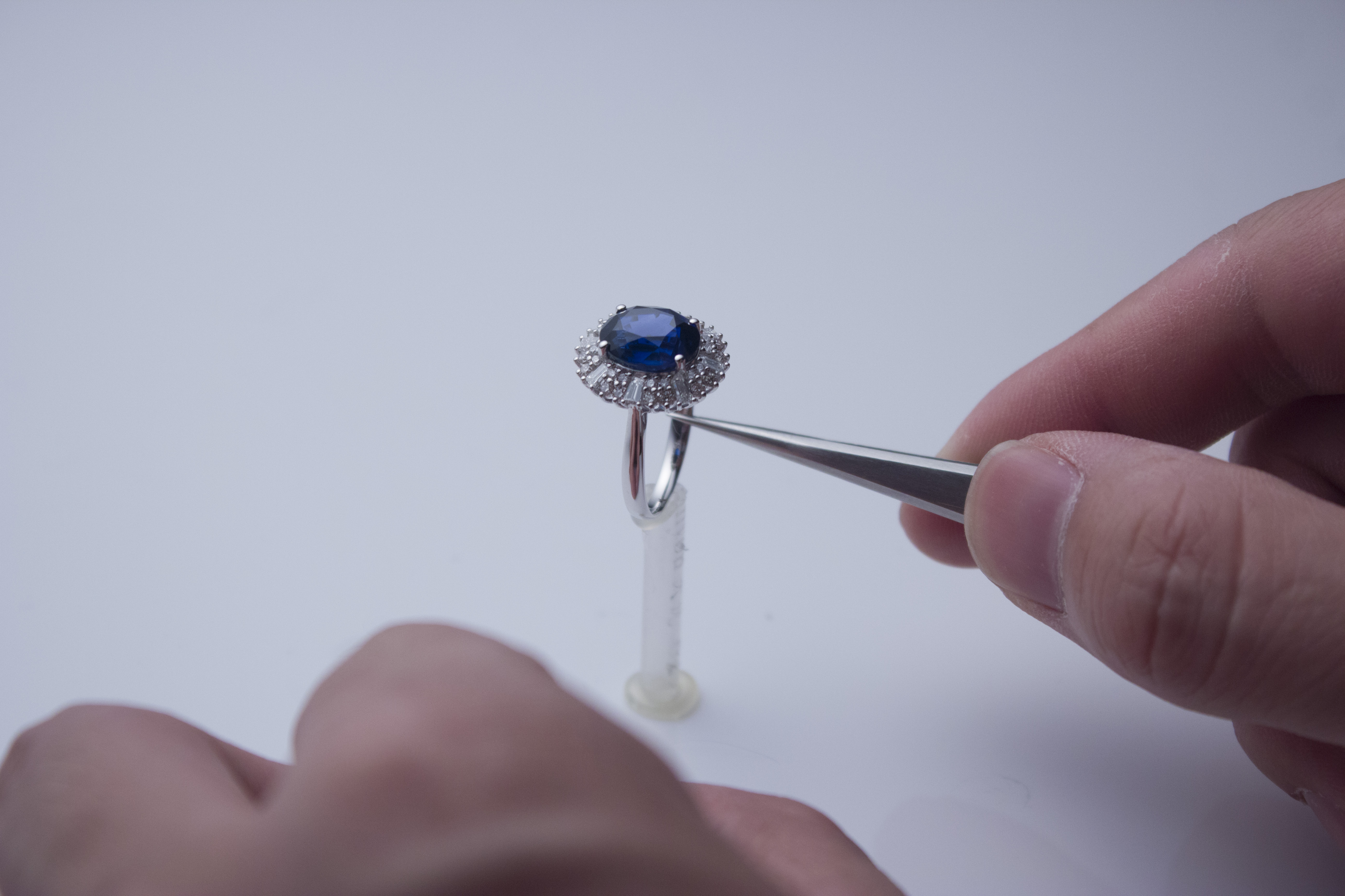 珠宝产品复杂,结构特殊,因此在正式拍摄之前我们需要提前分析珠宝的特性,然后用不同的方式去处理不同材质与结构。我们这次拍摄的是一个蓝宝石镶嵌戒指,从材质上分为:蓝宝石、18K金白、钻石、方形钻石;从结构上区分是:花头、戒圈。